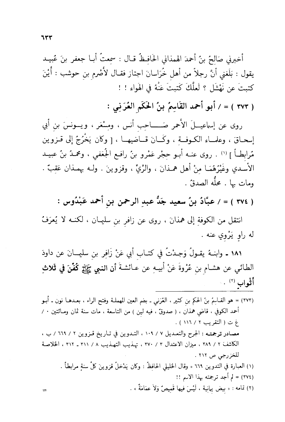 §أَبُو أَحْمَدَ الْقَاسِمُ بْنُ الْحَكَمِ الْعُرَنِيُّ رَوَى عَنْ إِسْمَاعِيلَ الْأَحْمَرِ صَاحِبِ أَنَسٍ، وَمِسْعَرٍ، وَيُونُسَ بْنِ أَبِي إِسْحَاقَ، وَعُلَمَاءِ الْكُوفَةِ، وَكَانَ قَاضِيَهَا، وَكَانَ يَخْرُجُ إِلَى قَزْوِينَ مُرَابِطًا، رَوَى عَنْهُ أَبُو حِجْرٍ عَمْرُو بْنُ رَافِعٍ الْجُعْفِيُّ، وَمُحَمَّدُ بْنُ عُبَيْدٍ الْأَسَدِيُّ، وَغَيْرُهُمَا مِنْ أَهْلِ هَمَذَانَ، وَالرَّيِّ، وَقَزْوِينَ، وَلَهُ بِهَمَذانَ عَقِبٌ، وَمَاتَ بِهَا، مَحِلُّهُ الصِّدْقُ.