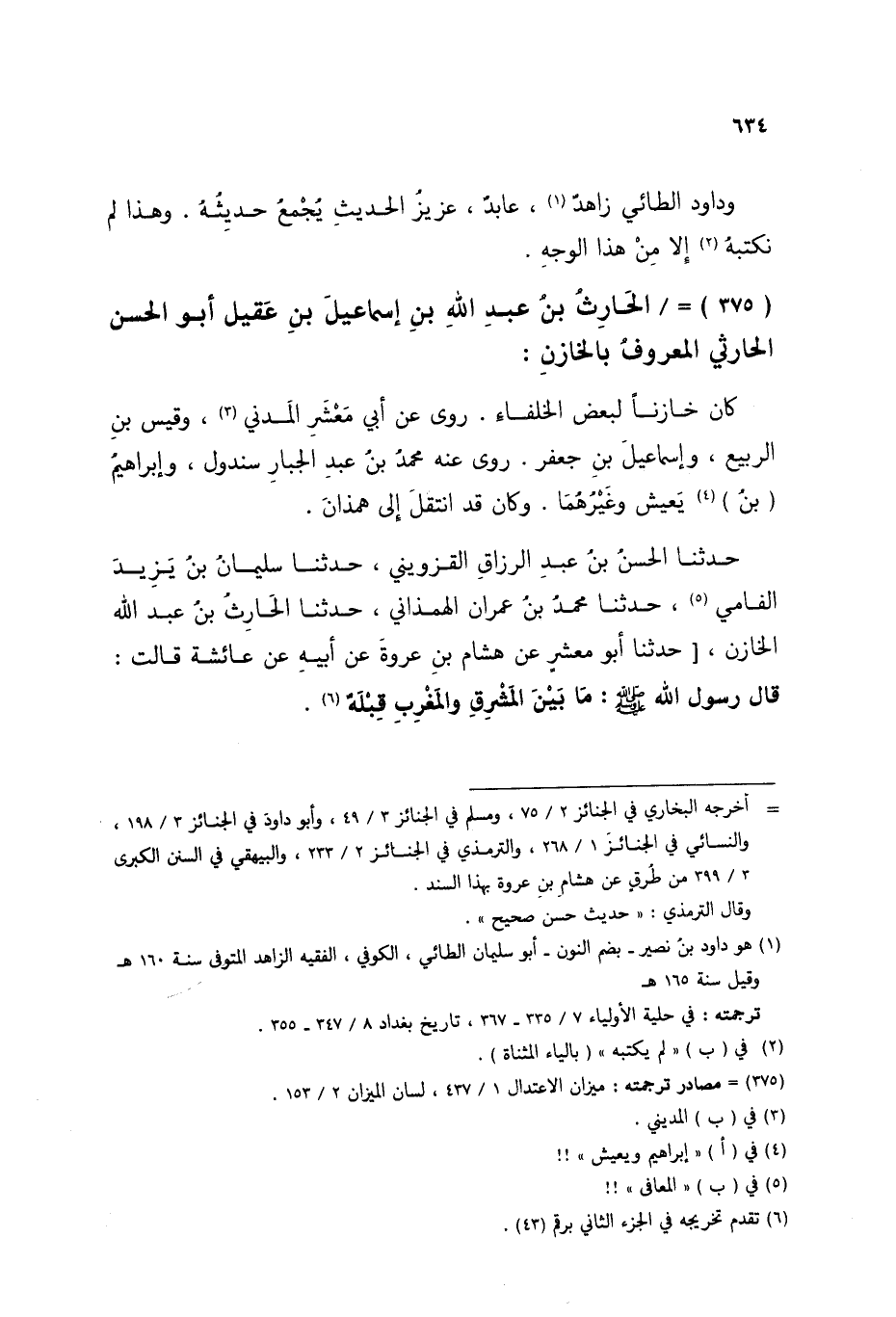 حَدَّثَنَا الْحَسَنُ بْنُ عَبْدِ الرَّزَّاقِ الْقَزْوِينِيُّ، حَدَّثَنَا سُلَيْمَانُ بْنُ يَزِيدَ الْفَامِيُّ، حَدَّثَنَا مُحَمَّدُ بْنُ عِمْرَانَ الْهَمَذَانِيُّ، حَدَّثَنَا الْحَارِثُ بْنُ عَبْدِ اللَّهِ الْخَازِنُ، حَدَّثَنَا أَبُو مَعْشَرٍ، عَنْ هِشَامِ بْنِ عُرْوَةَ، عَنْ أَبِيهِ، عَنْ عَائِشَةَ، قَالَتْ: قَالَ رَسُولُ اللَّهِ صَلَّى اللهُ عَلَيْهِ وَسَلَّمَ: §«مَا بَيْنَ الْمَشْرِقِ وَالْمَغْرِبِ قِبْلَةٌ»