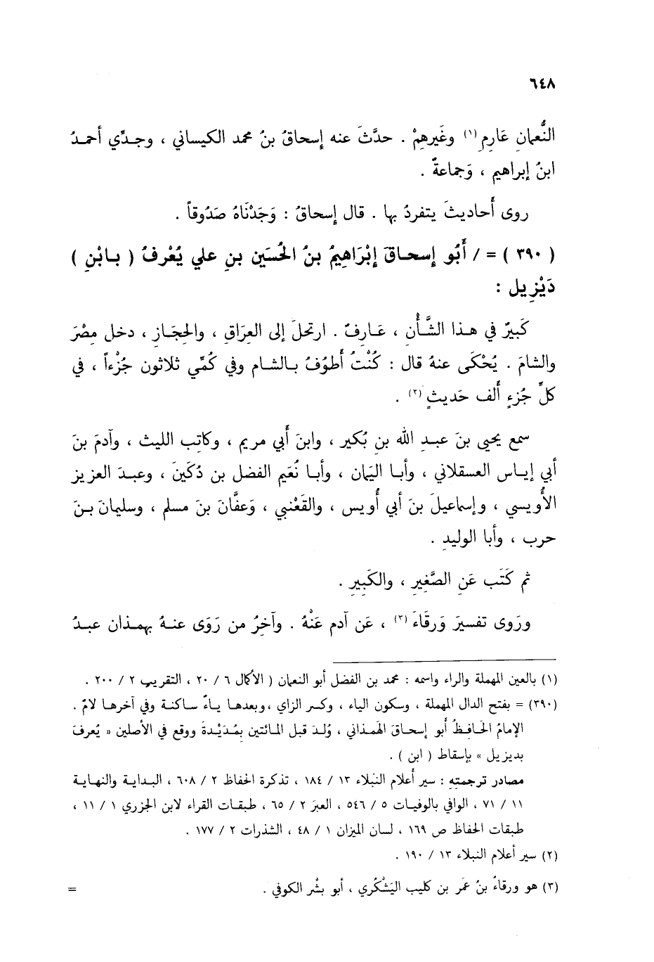 §أَبُو إِسْحَاقَ إِبْرَاهِيمُ بْنُ الْحُسَيْنِ بْنِ عَلِيٍّ يُعْرَفُ بِابْنِ دِيزِيلَ كَبِيرٌ فِي هَذَا الشَّأْنِ، عَارِفٌ، ارْتَحَلَ إِلَى الْعِرَاقِ، وَالْحِجَازِ، دَخَلَ مِصْرَ، وَالشَّامَ، يُحْكَى عَنْهُ قَالَ: كُنْتُ أَطُوفُ بِالشَّامِ، وَفِي كُمِّي ثَلَاثُونَ جُزْءًا فِي كُلِّ جُزْءٍ أَلْفُ حَدِيثٍ سَمِعَ يَحْيَى بْنَ عَبْدِ اللَّهِ بْنِ بُكَيْرٍ، وَابْنَ أَبِي مَرْيَمَ، وَكَاتِبَ اللَّيْثِ، وَآدَمَ بْنَ أَبِي إِيَاسَ الْعَسْقَلَانِيَّ، وَأَبَا الْيَمَانِ، وَأَبَا نُعَيْمٍ الْفَضْلَ بْنَ دُكَيْنٍ، وَعَبْدَ الْعَزِيزِ الْأُوَيْسِيَّ، وَإِسْمَاعِيلَ بْنَ أَبِي أُوَيْسٍ، وَالْقَعْنَبِيَّ، وَعَفَّانَ بْنَ مُسْلِمٍ، وَسُلَيْمَانَ بْنَ حَرْبٍ، وَأَبَا الْوَلِيدِ، ثُمَّ كَتَبَ عَنِ الصَّغِيرِ وَالْكَبِيرِ، وَرَوَى تَفْسِيرَ وَرْقَاءَ، عَنْ آدَمَ عَنْهُ، وَآخِرُ مَنْ رَوَى عَنْهُ بِهَمَذَانَ، عَبْدُ -[649]- الرَّحْمَنِ بْنُ عُبَيْدٍ الْأَسَدِيُّ، وَمَاتَ بَعْدَ السَّبْعِينَ