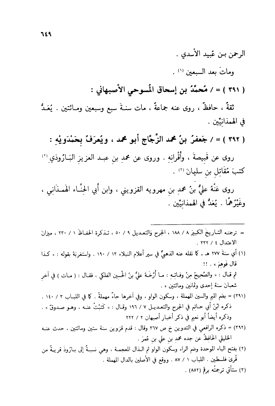 §مُحَمَّدُ بْنُ إِسْحَاقَ الْمُسُوحِيُّ الْأَصْبَهَانِيُّ ثِقَةٌ، حَافِظٌ، رَوَى عَنْهُ جَمَاعَةٌ، مَاتَ سَنَةَ سَبْعٍ وَسَبْعِينَ وَمِائَتَيْنِ، يُعَدُّ فِي الْهَمَذَانِيِّينَ