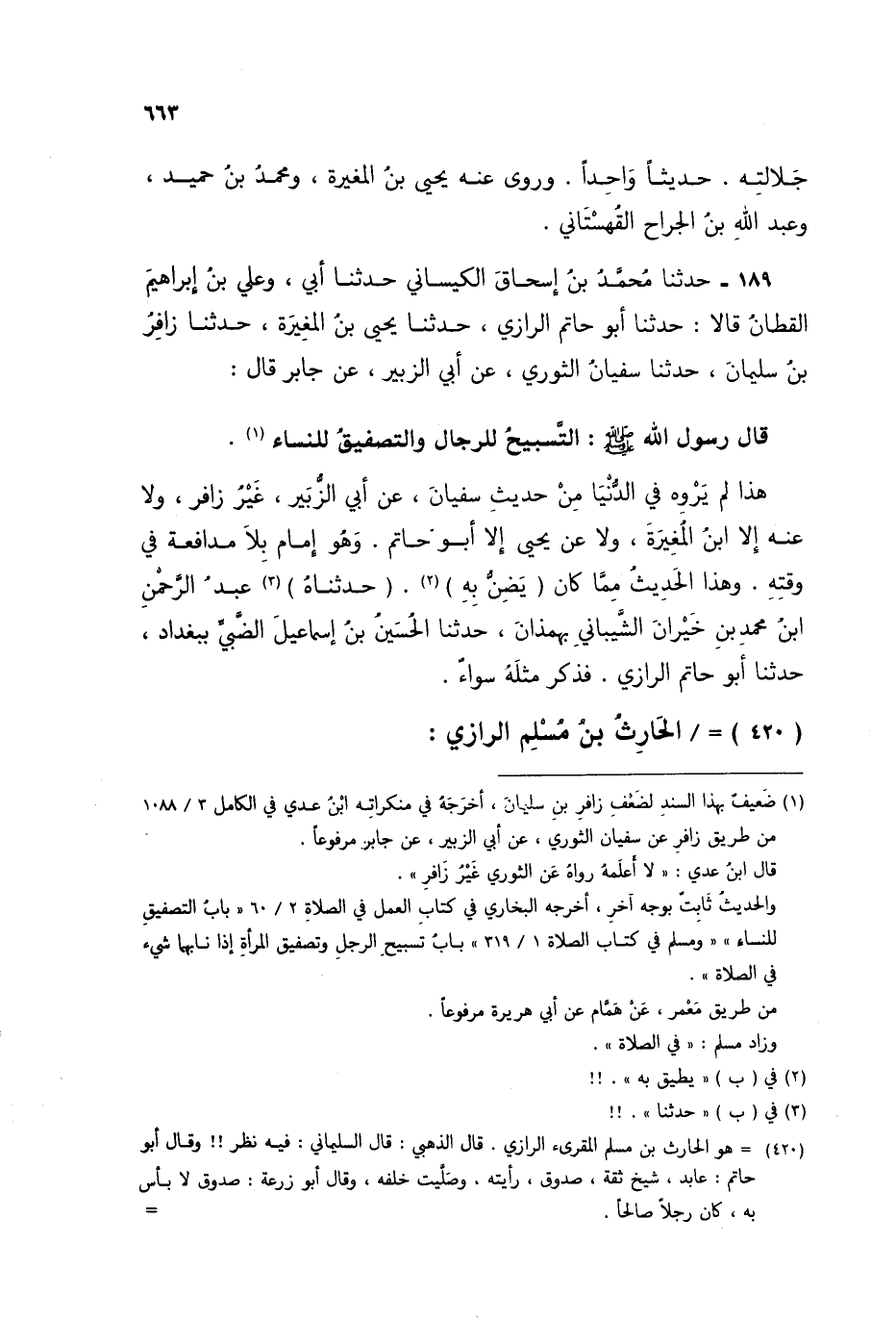 189 - حَدَّثَنَا مُحَمَّدُ بْنُ إِسْحَاقَ الْكَيْسَانِيُّ، حَدَّثَنَا أَبِي، وَعَلِيُّ بْنُ إِبْرَاهِيمَ الْقَطَّانُ، قَالَا: حَدَّثَنَا أَبُو حَاتِمٍ الرَّازِيُّ، حَدَّثَنَا يَحْيَى بْنُ الْمُغِيرَةِ، حَدَّثَنَا زَافِرُ بْنُ سُلَيْمَانَ، حَدَّثَنَا سُفْيَانُ الثَّوْرِيُّ، عَنْ أَبِي الزُّبَيْرِ، عَنْ جَابِرٍ، قَالَ: قَالَ رَسُولُ اللَّهِ صَلَّى اللهُ عَلَيْهِ وَسَلَّمَ: §«التَّسْبِيحُ لِلرِّجَالِ وَالتَّصْفِيقُ لِلنِّسَاءِ» هَذَا لَمْ يَرْوِهِ فِي الدُّنْيَا مِنْ حَدِيثِ سُفْيَانَ عَنْ أَبِي الزُّبَيْرِ غَيْرُ زَافِرٍ، وَلَا عَنْهُ إِلَّا ابْنُ الْمُغِيرَةِ، وَلَا عَنْ يَحْيَى، إِلَّا أَبُو حَاتِمٍ، وَهُوَ إِمَامٌ بِلَا مُدَافَعَةٍ فِي وَقْتِهِ، وَهَذَا الْحَدِيثُ مِمَّا كَانَ يَضِنُّ بِهِ. حَدَّثَنَاهُ عَبْدُ الرَّحْمَنِ بْنُ مُحَمَّدِ بْنِ خَيْرَانَ الشَّيْبَانِيُّ بِهَمَذَانَ حَدَّثَنَا الْحُسَيْنُ بْنُ إِسْمَاعِيلَ الضَّبِّيُّ بِبَغْدَادَ، حَدَّثَنَا أَبُو حَاتِمٍ الرَّازِيُّ فَذَكَرَ مِثْلَهُ سَوَاءً