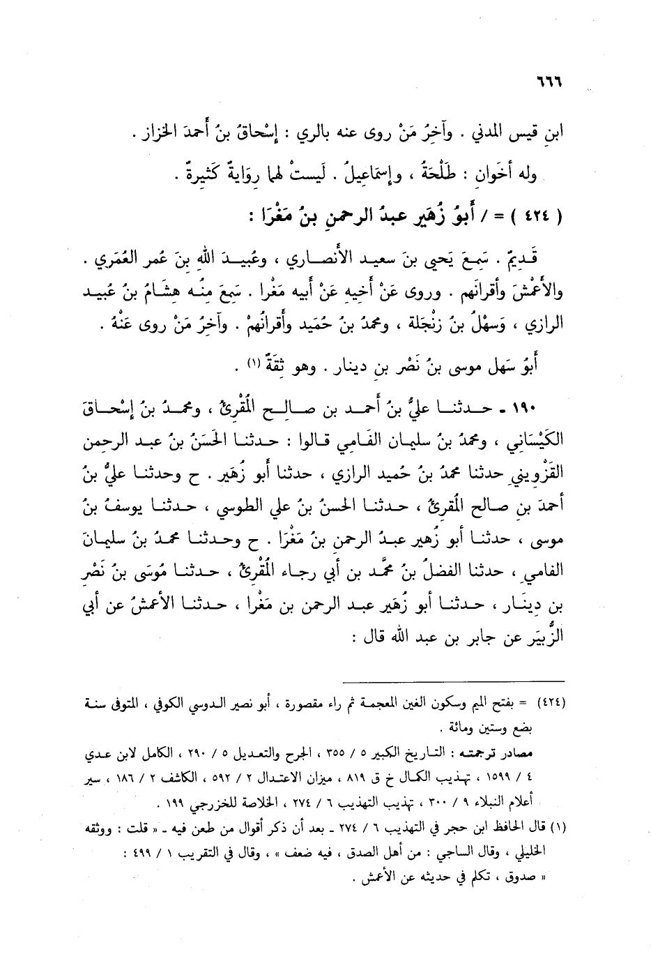§أَبُو زُهَيْرٍ عَبْدُ الرَّحْمَنِ بْنُ مَغْرَا قَدِيمٌ سَمِعَ يَحْيَى بْنَ سَعِيدٍ الْأَنْصَارِيَّ، وَعُبَيْدَ اللَّهِ بْنَ عُمَرَ الْعُمَرِيَّ، وَالْأَعْمَشَ، وَأَقْرَانَهُمْ، وَرَوَى عَنْ أَخِيهِ عَنْ أَبِيهِ مَغْرَا، سَمِعَ مِنْهُ هِشَامُ بْنُ عُبَيْدٍ الرَّازِيُّ، وَسَهْلُ بْنُ زَنْجَلَةَ، وَمُحَمَّدُ بْنُ حُمَيْدٍ، وَأَقْرَانُهُمْ، وَآخِرُ مَنْ رَوَى عَنْهُ أَبُو سَهْلٍ مُوسَى بْنُ نَصْرِ بْنِ دِينَارٍ، وَهُوَ ثِقَةٌ