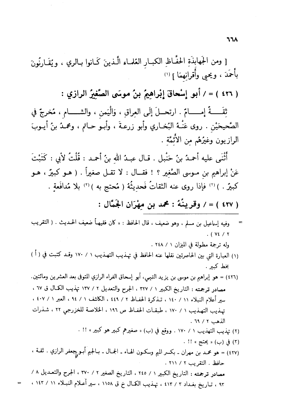 §أَبُو إِسْحَاقَ إِبْرَاهِيمُ بْنُ مُوسَى الصَّغِيرُ الرَّازِيُّ ثِقَةٌ، إِمَامٌ، ارْتَحَلَ إِلَى الْعِرَاقِ وَالْيَمَنِ، وَالشَّامِ، مُخَرَّجُ فِي الصَّحِيحَيْنِ، رَوَى عَنْهُ الْبُخَارِيُّ، وَأَبُو زُرْعَةَ، وَأَبُو حَاتِمٍ، وَمُحَمَّدُ بْنُ أَيُّوبَ الرَّازِيُّونَ، وَغَيْرُهُمْ مِنَ الْأَئِمَّةِ، أَثْنَى عَلَيْهِ أَحْمَدُ بْنُ حَنْبَلٍ قَالَ عَبْدُ اللَّهِ بْنُ أَحْمَدَ: قُلْتُ لِأَبِي: كَتَبْتُ عَنْ إِبْرَاهِيمَ بْنِ مُوسَى الصَّغِيرِ، فَقَالَ: لَا تَقُلْ صَغِيرًا هُوَ كَبِيرٌ هُوَ كَبِيرٌ، فَإِذَا رَوَى عَنْهُ الثِّقَاتُ فَحَدِيثُهُ مُحْتَجٌّ بِهِ بِلَا مُدَافَعَةٍ