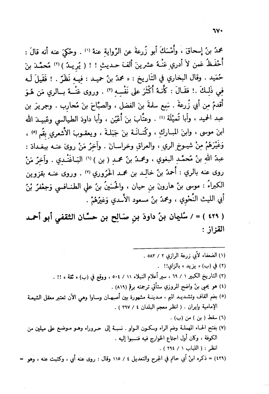 مُحَمَّدُ بْنُ إِسْحَاقَ، وَأَمْسَكَ أَبُو زُرْعَةَ عَنِ الرِّوَايَةِ عَنْهُ، وَحُكِيَ عَنْهُ أَنَّهُ قَالَ: أَحْفَظُ عَمَّنْ لَا أَدْرِي عَنْهُ عِشْرِينَ أَلْفَ حَدِيثٍ، يُرِيدُ مُحَمَّدَ بْنَ حُمَيْدٍ، وَقَالَ الْبُخَارِيُّ فِي التَّارِيخِ: مُحَمَّدُ بْنُ حُمَيْدٍ فِيهِ نَظَرٌ، فَقِيلَ لَهُ فِي ذَلِكَ: فَقَالَ: كَأَنَّهُ أَكْثَرَ عَلَى نَفْسِهِ، وَرَوَى عَنْهُ بِالرَّيِّ مَنْ هُوَ أَقْدَمُ مِنْ أَبِي زُرْعَةَ، سَمِعَ سَلَمَةَ بْنَ الْفَضْلِ، وَالصَّبَّاحَ بْنَ مُحَارِبٍ، وَجَرِيرَ بْنَ عَبْدِ الْحَمِيدِ، وَأَبَا تُمَيْلَةَ، وَعَتَّابَ بْنَ أَعْيَنَ، وَأَبَا دَاوُدَ الطَّيَالِسِيَّ، وَعُبَيْدَ اللَّهِ بْنَ مُوسَى، وَابْنَ الْمُبَارَكِ، وَكُنَانَةَ بْنَ جَبَلَةَ، وَيَعْقُوبَ الْأَشْعَرِيَّ، بِقُمٍّ، وَغَيْرِهِمْ مِنْ شُيُوخِ الرَّيِّ، وَالْعِرَاقِ، وَخُرَاسَانَ، وَآخِرُ مَنْ رَوَى عَنْهُ بِبَغْدَادَ عَبْدُ اللَّهِ بْنُ مُحَمَّدٍ الْبَغَوِيُّ، وَمُحَمَّدُ بْنُ مُحَمَّدِ بْنِ الْبَاغَنْدِيُّ، وَآخِرُ مَنْ رَوَى عَنْهُ بِالرَّيِّ أَحْمَدُ بْنُ خَالِدِ بْنِ مُحَمَّدٍ الْحَرُورِيُّ، وَرَوَى عَنْهُ بِقَزْوِينَ الْكُبَرَاءُ مُوسَى بْنُ هَارُونَ بْنِ حَيَّانَ، وَالْحُسَيْنُ بْنُ عَلِيٍّ الطَّنَافِسِيُّ، وَجَعْفَرُ بْنُ أَبِي اللَّيْثِ النَّحْوِيُّ، وَمُحَمَّدُ بْنُ مَسْعُودٍ الْأَسَدِيُّ، وَغَيْرُهُمْ