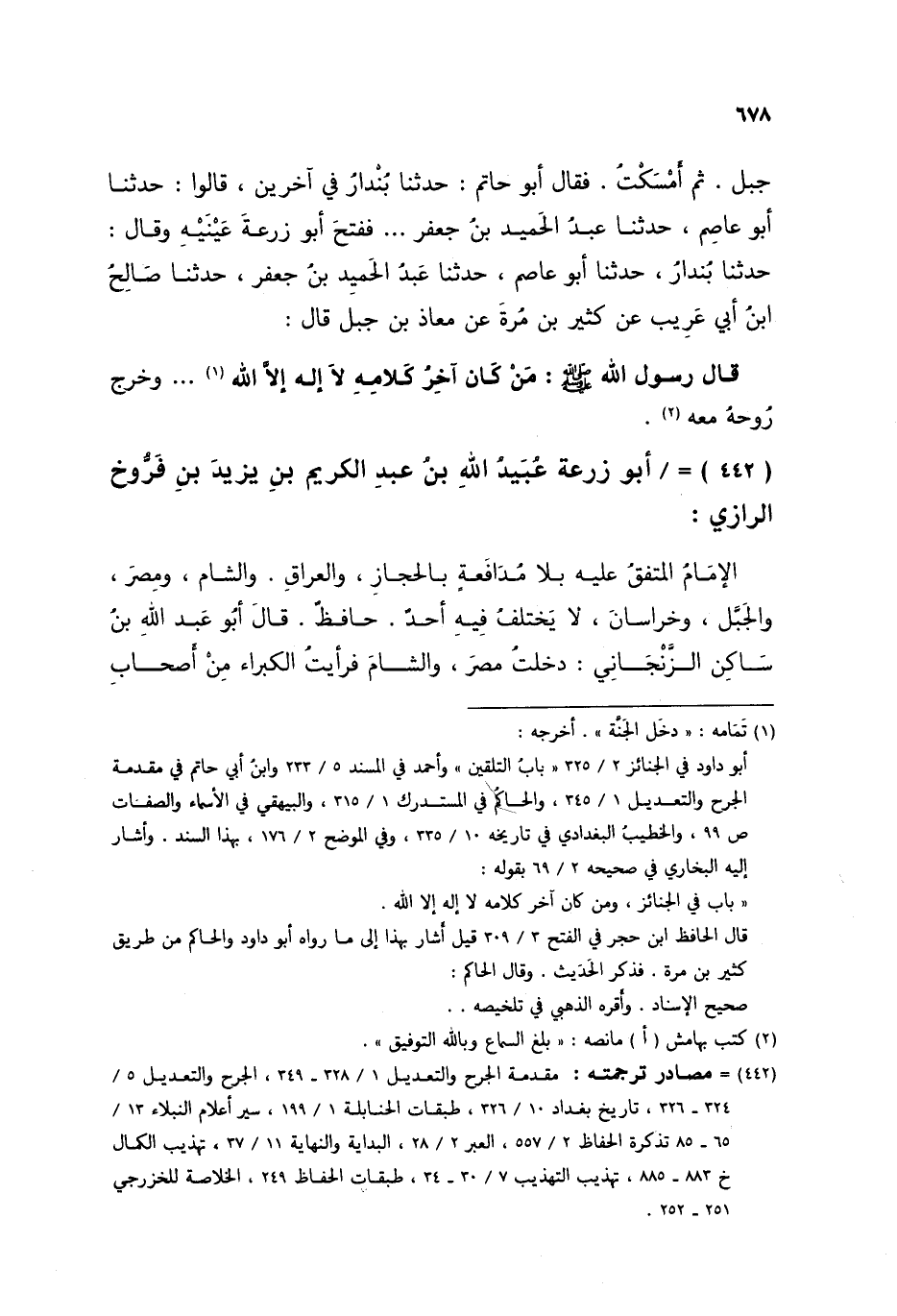 §أَبُو زُرْعَةَ عُبَيْدُ اللَّهِ بْنُ عَبْدِ الْكَرِيمِ بْنِ يَزِيدَ بْنِ فَرُّوخَ الرَّازِيُّ الْإِمَامُ، الْمُتَّفَقُ عَلَيْهِ بِلَا مُدَافَعَةٍ بِالْحِجَازِ، وَالْعِرَاقِ، وَالشَّامِ، وَمِصْرَ، وَالْجَبَلِ، وَخُرَاسَانَ، لَا يَخْتَلِفُ فِيهِ أَحَدٌ حَافِظٌ. قَالَ أَبُو عَبْدِ اللَّهِ بْنُ سَاكِنٍ الزَّنْجَانِيُّ: دَخَلْتُ مِصْرَ، وَالشَّامَ فَرَأَيْتُ الْكُبَرَاءَ مِنْ أَصْحَابِ
