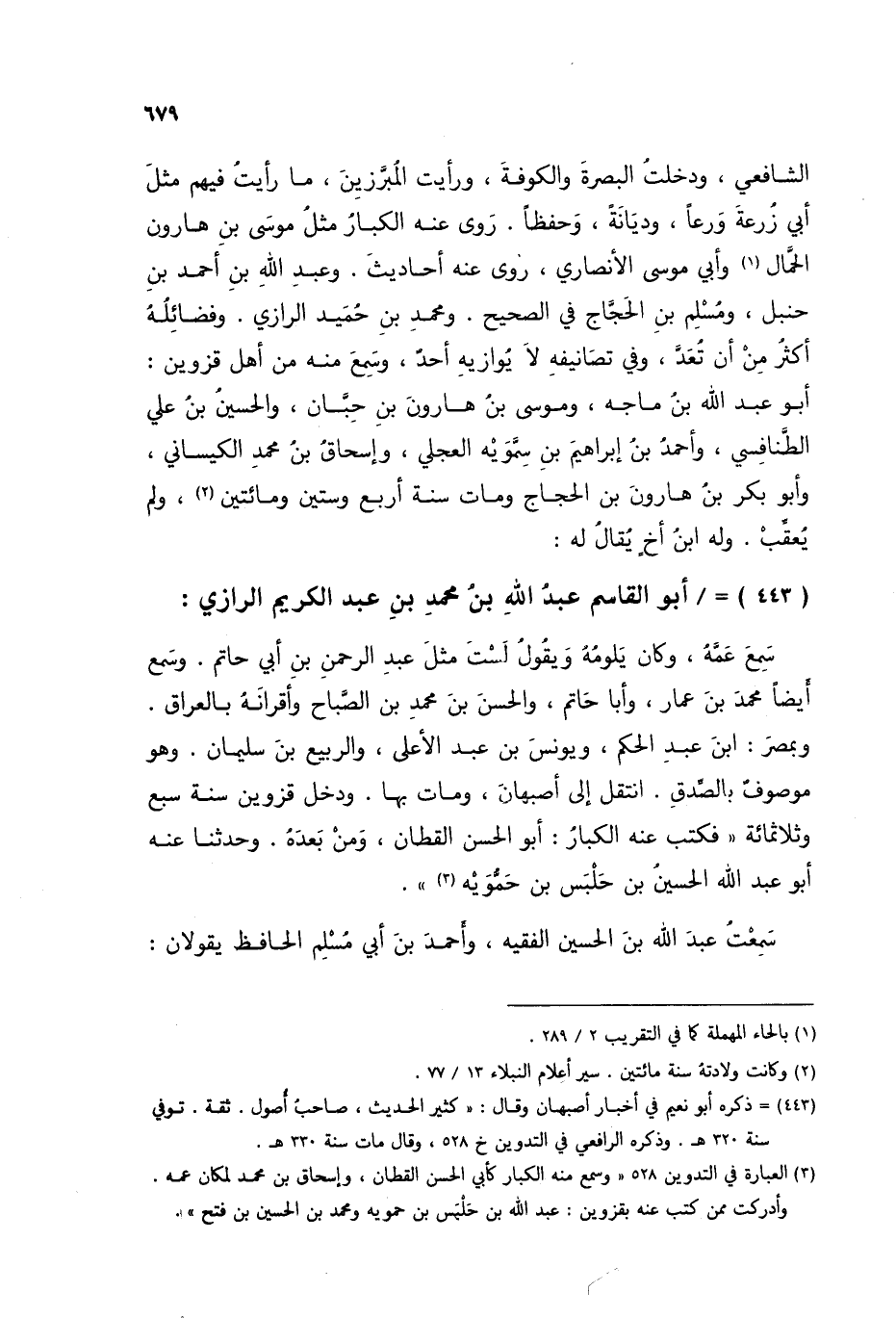 §أَبُو الْقَاسِمِ عَبْدُ اللَّهِ بْنُ مُحَمَّدِ بْنِ عَبْدِ الْكَرِيمِ الرَّازِيُّ سَمِعَ عَمَّهُ، وَكَانَ يَلُومُهُ، وَيَقُولُ: لَسْتُ مِثْلَ عَبْدِ الرَّحْمَنِ بْنِ أَبِي حَاتِمٍ، وَسَمِعَ أَيْضًا مُحَمَّدَ بْنَ عَمَّارٍ، وَأَبَا حَاتِمٍ، وَالْحَسَنَ بْنَ مُحَمَّدِ بْنِ الصَّبَّاحِ، وَأَقْرَانَهُ بِالْعِرَاقِ، وَبِمِصْرَ، ابْنَ عَبْدِ الْحَكَمِ، وَيُونُسَ بْنَ عَبْدِ الْأَعْلَى، وَالرَّبِيعَ بْنَ سُلَيْمَانَ، وَهُوَ مَوْصُوفٌ بِالصِّدْقِ، انْتَقَلَ إِلَى أَصْبَهَانَ، وَمَاتَ بِهَا وَدَخَلَ قَزْوِينَ سَنَةَ سَبْعٍ وَثَلَاثِمِائَةٍ، فَكَتَبَ عَنْهُ الْكِبَارُ أَبُو الْحَسَنِ الْقَطَّانُ، وَمَنْ بَعْدَهُ وَحَدَّثَنَا عَنْهُ أَبُو عَبْدِ اللَّهِ الْحُسَيْنُ بْنُ حَلْبَسِ بْنِ حَمُّويَهْ سَمِعْتُ عَبْدَ اللَّهِ بْنَ الْحُسَيْنِ الْفَقِيهَ، وَأَحْمَدَ بْنَ أَبِي مُسْلِمٍ الْحَافِظَ يَقُولَانِ