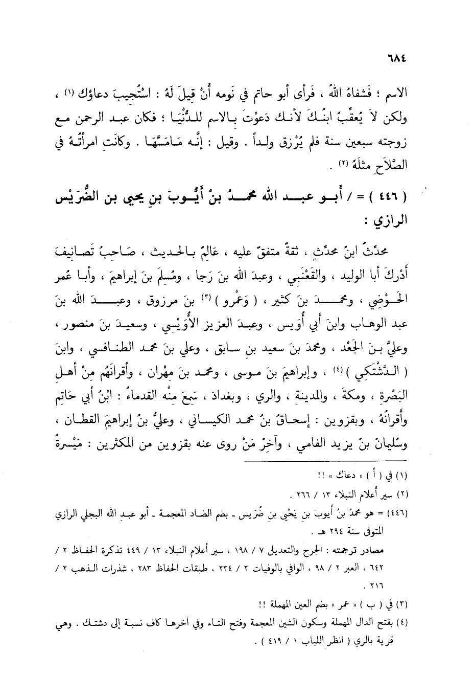 §أَبُو عَبْدِ اللَّهِ مُحَمَّدُ بْنُ أَيُّوبَ بْنِ يَحْيَى بْنِ الضُّرَيْسُ الرَّازِيُّ مُحَدِّثٌ، ابْنُ مُحَدِّثٌ، ثِقَةٌ، مُتَّفَقٌ عَلَيْهِ، عَالِمٌ بِالْحَدِيثِ، صَاحِبُ تَصَانِيفَ، أَدْرَكَ أَبَا الْوَلِيدِ، وَالْقَعْنَبِيَّ، وَعَبْدَ اللَّهِ بْنَ رَجَا، وَمُسْلِمَ بْنَ إِبْرَاهِيمَ، وَأَبَا عُمَرَ الْحَوْضِيَّ، وَمُحَمَّدَ بْنَ كَثِيرٍ، وَعَمْرَو بْنَ مَرْزُوقٍ، وَعَبْدَ اللَّهِ بْنَ عَبْدِ الْوَهَّابِ، وَابْنَ أَبِي أُوَيْسٍ، وَعَبْدَ الْعَزِيزِ الْأُوَيْسِيَّ، وَسَعِيدَ بْنَ مَنْصُورٍ، وَعَلِيُّ بْنَ الْجَعْدِ، وَمُحَمَّدَ بْنَ سَعِيدِ بْنِ سَابِقٍ، وَعَلِيَّ بْنَ مُحَمَّدٍ الطَّنَافِسِيَّ، وَابْنَ الدَّشْتَكِيَّ، وَإِبْرَاهِيمَ بْنَ مُوسَى، وَمُحَمَّدَ بْنَ مِهْرَانَ، وَأَقْرَانَهُمْ مِنْ أَهْلِ الْبَصْرَةِ، وَمَكَّةَ، وَالْمَدِينَةِ، وَالرَّيِّ، وَبَغْدَادَ، سَمِعَ مِنْهُ الْقُدَمَاءُ ابْنُ أَبِي حَاتِمٍ، وأَقْرَانُهُ، وَبِقَزْوِينَ، إِسْحَاقُ بْنُ مُحَمَّدٍ الْكَيْسَانِيُّ، وَعَلِيُّ بْنُ إِبْرَاهِيمَ الْقَطَّانُ، وَسُلَيْمَانُ بْنُ يَزِيدَ الْفَامِيُّ، وَآخِرُ مَنْ رَوَى عَنْهُ بِقَزْوِينَ مِنَ الْمُكْثِرِينَ مَيْسَرَةُ