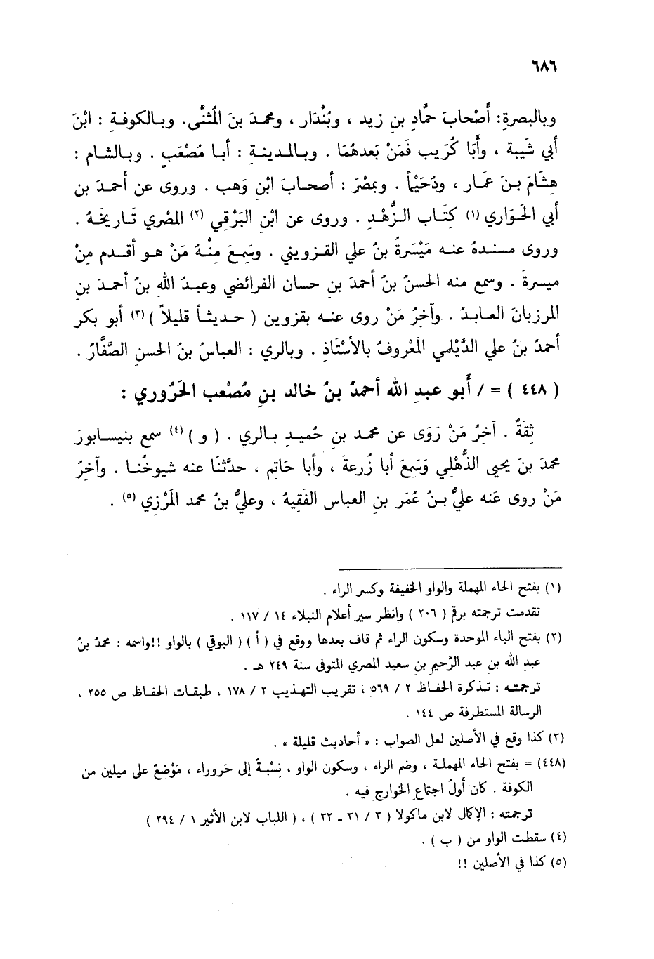 §أَبُو عَبْدِ اللَّهِ أَحْمَدُ بْنُ خَالِدِ بْنِ مُصْعَبٍ الْحَرُورِيُّ ثِقَةٌ، آخِرُ مَنْ رَوَى عَنْ مُحَمَّدِ بْنِ حُمَيْدٍ بِالرَّيِّ، وَسَمِعَ بِنَيْسَابُورَ مُحَمَّدُ بْنُ يَحْيَى الذُّهْلِيُّ، وَسَمِعَ أَبَا زُرْعَةَ، وَأَبَا حَاتِمٍ، حَدَّثَنَا عَنْهٌ شُيُوخُنَا، وَآخِرُ مَنْ رَوَى عَنْهُ عَلِيُّ بْنُ عُمَرَ بْنِ الْعَبَّاسِ الْفَقِيهُ، وَعَلِيُّ بْنُ مُحَمَّدٍ الْمَرْوَزِيُّ