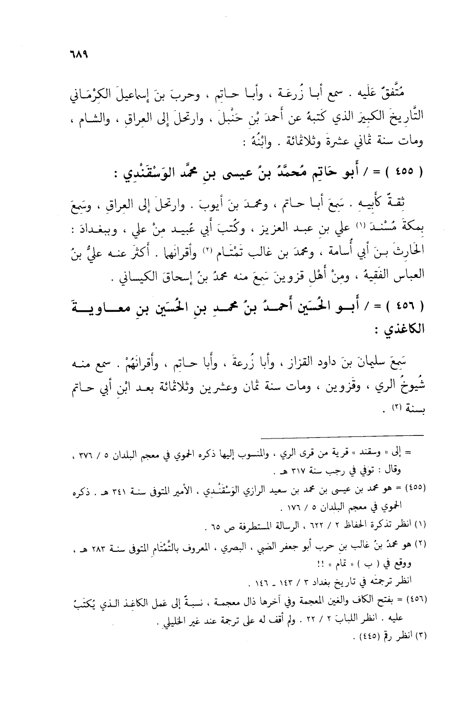 §أَبُو حَاتِمٍ مُحَمَّدُ بْنُ عِيسَى بْنِ مُحَمَّدٍ الْوَسْقَنْدِيُّ ثِقَةٌ كَأَبِيهِ، سَمِعَ أَبَا حَاتِمٍ، وَمُحَمَّدَ بْنَ أَيُّوبَ، وَارْتَحَلَ إِلَى الْعِرَاقِ، وَسَمِعَ بِمَكَّةَ مُسْنَدَ عَلِيِّ بْنِ عَبْدِ الْعَزِيزِ، وَكُتُبَ أَبِي عُبَيْدٍ مِنْ عَلِيٍّ، وَبِبَغْدَادَ الْحَارِثَ بْنَ أَبِي أُسَامَةَ، وَمُحَمَّدَ بْنَ غَالِبٍ تَمْتَامٍ، وَأَقْرَانَهُمَا، أَكْثَرَ عَنْهُ عَلِيُّ بْنُ الْعَبَّاسِ الْفَقِيهُ، وَمِنْ أَهْلِ قَزْوِينَ سَمِعَ مِنْهُ مُحَمَّدُ بْنُ إِسْحَاقَ الْكَيْسَانِيُّ