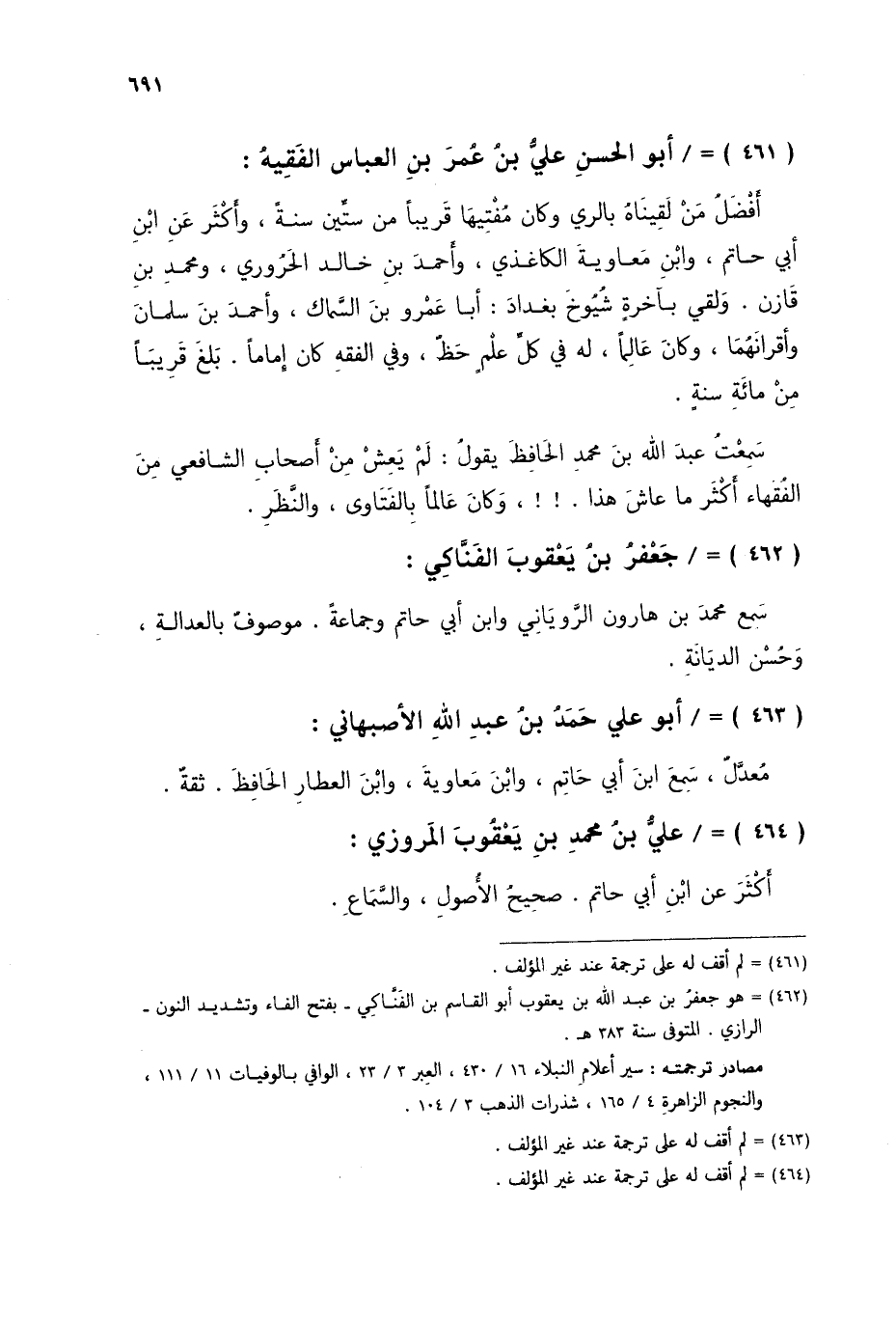 §جَعْفَرُ بْنُ يَعْقُوبَ الْفَنَّاكِيُّ سَمِعَ مُحَمَّدَ بْنَ هَارُونَ الرُّويَانِيُّ، وَابْنَ أَبِي حَاتِمٍ، وَجَمَاعَةً، مَوْصُوفٌ بِالْعَدَالَةِ وَحُسْنِ الدِّيَانَةِ