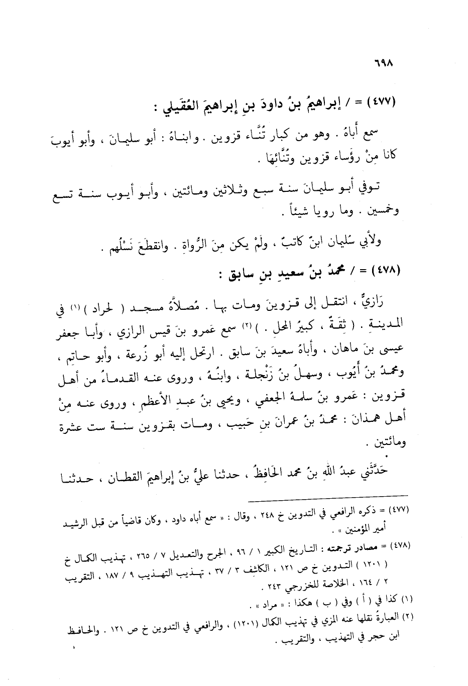 §إِبْرَاهِيمُ بْنُ دَاوُدَ بْنِ إِبْرَاهِيمَ الْعُقَيْلِيُّ سَمِعَ أَبَاهُ، وَهُوَ مِنْ كِبَارِ تِنَاءِ قَزْوِينَ، وَابْنَاهُ أَبُو سُلَيْمَانَ، وَأَبُو أَيُّوبَ كَانَا مِنْ رُؤَسَاءِ قَزْوِينَ، وَتِنَائِهَا، تُوُفِّيَ أَبُو سُلَيْمَانَ سَنَةَ سَبْعٍ وَثَلَاثِينَ وَمِائَتَيْنِ، وَأَبُو أَيُّوبَ سَنَةَ تِسْعٍ وَخَمْسِينَ، وَمَا رَوَيَا شَيْئًا وَلِأَبِي سُلَيْمَانَ ابْنٌ كَاتِبٌ، وَلَمْ يَكُنْ مِنَ الرُّوَاةِ وَانْقَطَعَ نَسْلُهُمْ