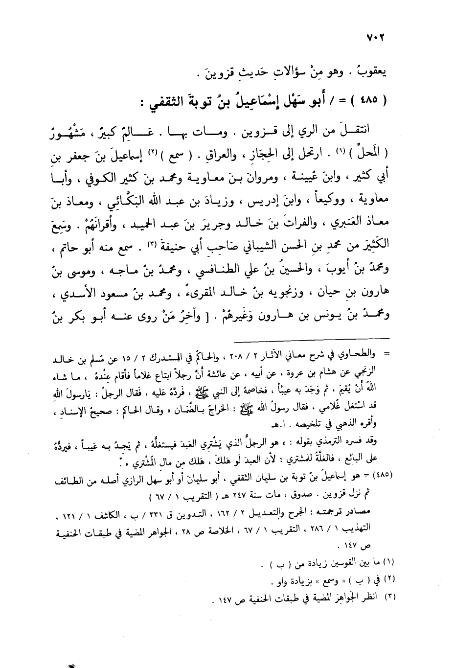 §أَبُو سَهْلٍ إِسْمَاعِيلُ بْنُ تَوْبَةِ الثَّقَفِيُّ انْتَقَلَ مِنَ الرَّيِّ إِلَى قَزْوِينَ، وَمَاتَ بِهَا، عَالِمٌ، كَبِيرٌ، مَشْهُورُ الْمَحَلِّ، ارْتَحَلَ إِلَى الْحِجَازِ، وَالْعِرَاقِ، سَمِعَ إِسْمَاعِيلَ بْنَ جَعْفَرِ بْنِ أَبِي كَثِيرٍ، وَابْنَ عُيَيْنَةَ، وَمَرْوَانَ بْنَ مُعَاوِيَةَ، وَمُحَمَّدَ بْنَ كَثِيرٍ الْكُوفِيَّ، وَأَبَا مُعَاوِيَةَ، وَوَكِيعًا، وَابْنَ إِدْرِيسَ، وَزِيَادَ بْنَ عَبْدِ اللَّهِ الْبَكَّائِيَّ، وَمُعَاذَ بْنَ مُعَاذٍ الْعَنْبَرِيَّ، وَالْفُرَاتَ بْنَ خَالِدٍ، وَجَرِيرَ بْنَ عَبْدِ الْحَمِيدِ، وَأَقْرَانَهُمْ، وَسَمِعَ الْكَثِيرَ مِنْ مُحَمَّدِ بْنِ الْحَسَنِ الشَّيْبَانِيِّ صَاحِبِ أَبِي حَنِيفَةَ، سَمِعَ مِنْهُ أَبُو حَاتِمٍ، وَمُحَمَّدُ بْنُ أَيُّوبَ، وَالْحُسَيْنُ بْنُ عَلِيٍّ الطَّنَافِسِيُّ، وَمُحَمَّدُ بْنُ مَاجَهْ، وَمُوسَى بْنُ هَارُونَ بْنِ حَيَّانَ، وَزَنْجُوَيْهِ بْنُ خَالِدٍ الْمُقْرِئُ، وَمُحَمَّدُ بْنُ مَسْعُودٍ الْأَسَدِيُّ، وَمُحَمَّدُ بْنُ يُونُسَ بْنِ هَارُونَ، وَغَيْرُهُمْ، وَآخِرُ مَنْ رَوَى عَنْهُ أَبُو بَكْرِ بْنُ