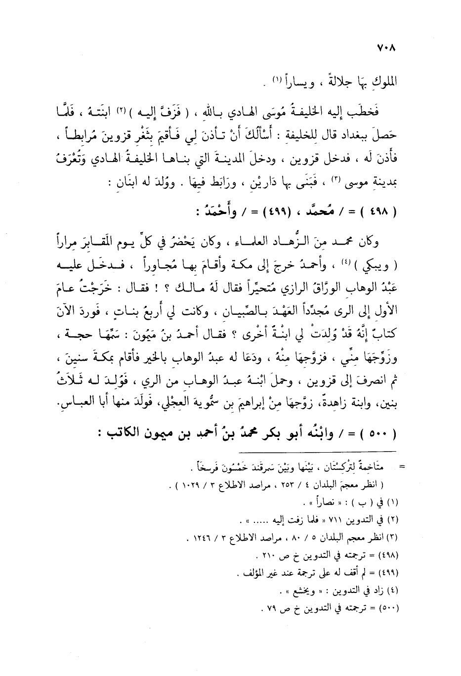 §وَأَحْمَدُ وَكَانَ مُحَمَّدٌ مِنَ الزُّهَّادِ الْعُلَمَاءِ، وَكَانَ يَحْضُرُ فِي كُلِّ يَوْمٍ الْمَقَابِرَ مِرَارًا، وَيَبْكِي وَأَحْمَدُ خَرَجَ إِلَى مَكَّةَ، وَأَقَامَ بِهَا مُجَاوِرًا، فَدَخَلَ عَلَيْهِ عَبْدُ الْوَهَّابِ الْوَرَّاقُ الرَّازِيُّ مُتَحَيِّرًا، فَقَالَ لَهُ مَا لَكَ؟ فَقَالَ: خَرَجْتُ عَامَ الْأَوَّلِ إِلَى الرَّيِّ مُجَدِّدًا الْعَهْدَ بِالصِّبْيَانِ، وَكَانَتْ لِي أَرْبَعُ بَنَاتٍ، فَوَرَدَ الْآنَ كِتَابٌ أَنَّهُ قَدْ وُلِدَتْ لِي ابْنَةٌ أُخْرَى، فَقَالَ أَحْمَدُ بْنُ مَيْمُونٍ سَمِّهَا حَجَّةً، وَزَوِّجْهَا مِنِّي، فَزَوَّجَهَا مِنْهُ وَدَعَا لَهُ عَبْدُ الْوَهَّابِ بِالْخَيْرِ، فَأَقَامَ بِمَكَّةَ سِنِينَ، ثُمَّ انْصَرَفَ إِلَى قَزْوِينَ، وَحَمَلَ ابْنَهُ عَبْدُ الْوَهَّابِ مِنَ الرَّيِّ فَوُلِدَ لَهُ ثَلَاثُ بَنِينَ وَابْنَةٌ زَاهِدَةٌ، زَوَّجَهَا مِنْ إِبْرَاهِيمَ بْنِ سَمَّوَيْهِ الْعِجْلِيِّ، فَوَلَدَ مِنْهَا أَبَا الْعَبَّاسِ