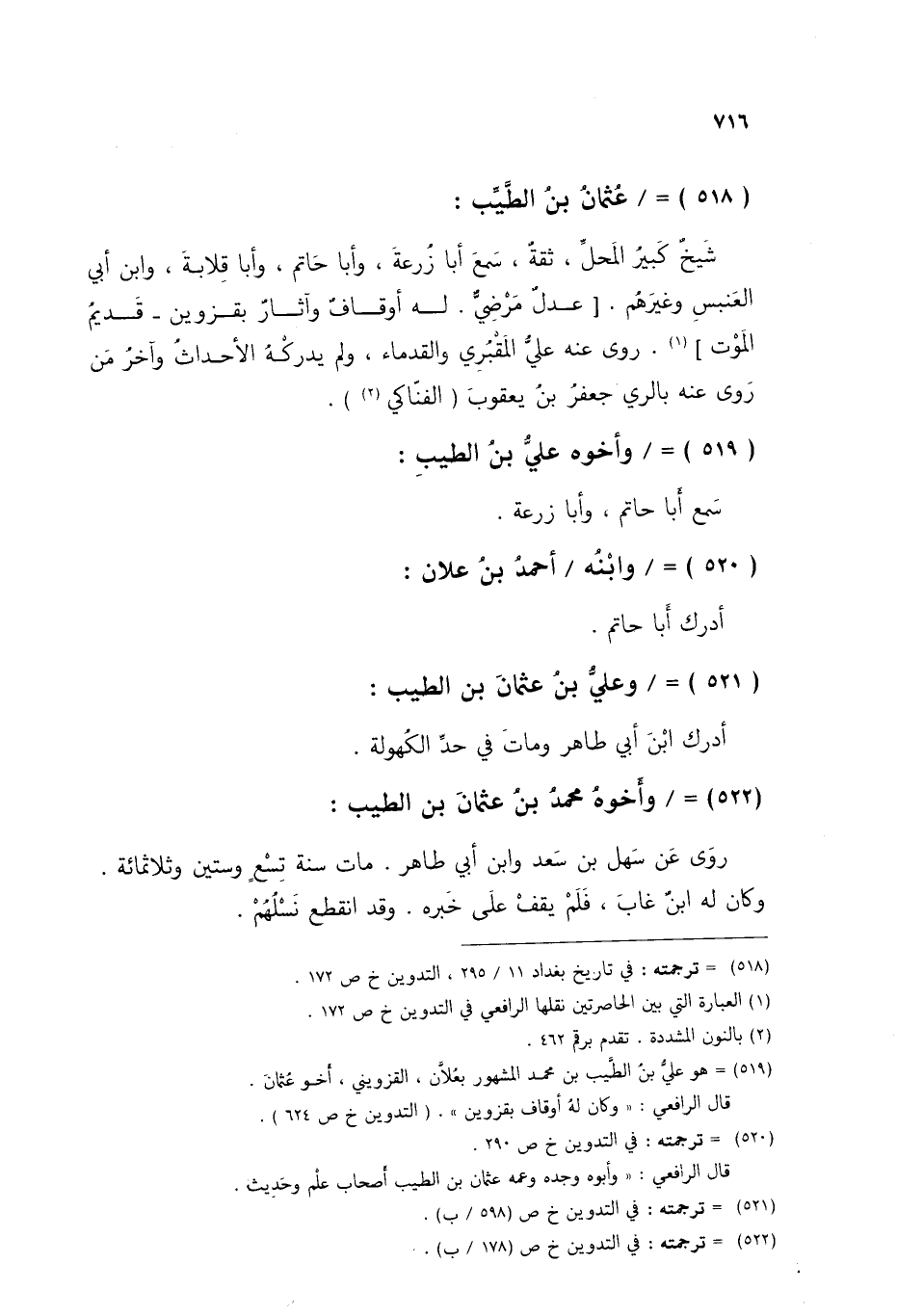 §عُثْمَانُ بْنُ الطَّيِّبِ شَيْخٌ، كَبِيرُ الْمَحَلِّ، ثِقَةٌ، سَمِعَ أَبَا زُرْعَةَ، وَأَبَا حَاتِمٍ، وَأَبَا قِلَابَةَ، وَابْنَ أَبِي الْعَنْبَسِ، وَغَيْرَهُمْ، عَدْلٌ، مَرْضِيُّ، لَهُ أَوْقَافٌ، وَآثَارٌ بِقَزْوِينَ، قَدِيمُ الْمَوْتِ، رَوَى عَنْهُ عَلِيُّ الْمَقْبُرِيُّ، وَالْقُدَمَاءُ، وَلَمْ يُدْرِكْهُ الْأَحْدَاثُ، وَآخِرُ مَنْ رَوَى عَنْهُ بِالرَّيِّ جَعْفَرُ بْنُ يَعْقُوبَ الْفَنَّاكِيُّ