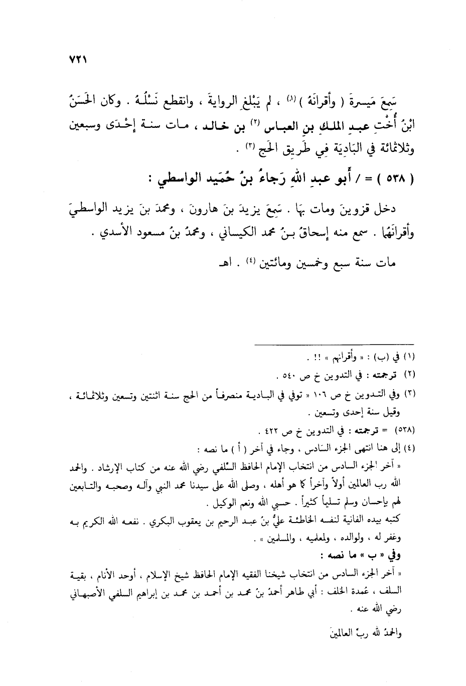 §أَبُو عَبْدِ اللَّهِ رَجَاءُ بْنُ حُمَيْدٍ الْوَاسِطِيُّ دَخَلَ قَزْوِينَ، وَمَاتَ بِهَا سَمِعَ يَزِيدَ بْنِ هَارُونَ، وَمُحَمَّدَ بْنَ يَزِيدَ الْوَاسِطِيَّ، وَأَقْرَانَهُمَا، سَمِعَ مِنْهُ إِسْحَاقُ بْنُ مُحَمَّدٍ الْكَيْسَانِيُّ، وَمُحَمَّدُ بْنُ مَسْعُودٍ الْأَسَدِيُّ، مَاتَ سَنَةَ سَبْعٍ وَخَمْسِينَ وَمِائَتَيْنِ