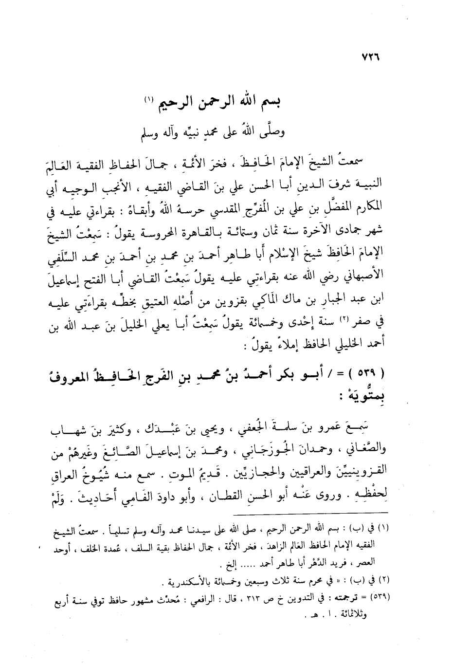 §أَبُو بَكْرٍ أَحْمَدُ بْنُ مُحَمَّدِ بْنِ الْفَرَجِ الْحَافِظُ الْمَعْرُوفُ بِمَتَّوَيْهِ سَمِعْتُ الشَّيْخَ الْإِمَامَ الْحَافِظَ، فَخْرَ الْأَئِمَّةِ، جَمَالَ الْحُفَّاظِ الْفَقِيهَ الْعَالِمَ النَّبِيهَ شَرَفَ الدِّينِ أَبَا الْحَسَنِ عَلِيَّ ابْنَ الْقَاضِي الْفَقِيهِ الْأَنْجَبِ الْوَجِيهِ أَبِي الْمَكَارِمِ الْمُفَضَّلِ بْنِ عَلِيِّ بْنِ الْمُفَرِّجِ الْمَقْدِسِيِّ حَرَسَهُ اللَّهُ وَأَبْقَاهُ: بِقِرَاءَتِي عَلَيْهِ فِي شَهْرِ جُمَادَى الْآخِرَةِ سَنَةَ ثَمَانٍ وَسِتِّمِائَةٍ بِالْقَاهِرَةِ الْمَحْرُوسَةِ يَقُولُ: سَمِعْتُ الشَّيْخَ الْإِمَامَ الْحَافِظَ شَيْخَ الْإِسْلَامِ أَبَا طَاهِرٍ أَحْمَدَ بْنَ مُحَمَّدِ بْنِ أَحْمَدَ بْنِ مُحَمَّدٍ السِّلَفِيَّ الْأَصْبَهَانِيَّ رَضِيَ اللَّهُ عَنْهُ، بِقِرَاءَتِي عَلَيْهِ يَقُولُ: سَمِعْتُ الْقَاضِيَ أَبَا الْفَتْحِ إِسْمَاعِيلَ بْنَ عَبْدِ الْجَبَّارِ بْنِ مَاكٍ الْمَاكِيَّ بِقَزْوِينَ مِنْ أَصْلِهِ الْعَتِيقِ بِخَطِّهِ بِقِرَاءَتِي عَلَيْهِ فِي صَفَرٍ سَنَةَ إِحْدَى وَخَمْسِمِائَةٍ يَقُولُ: سَمِعْتُ أَبَا يَعْلَي الْخَلِيلَ بْنَ عَبْدِ اللَّهِ بْنِ أَحْمَدَ الْخَلِيلِيَّ الْحَافِظَ إِمْلَاءً، يَقُولُ: أَبُو بَكْرٍ أَحْمَدُ بْنُ مُحَمَّدِ بْنِ الْفَرَجِ الْحَافِظُ الْمَعْرُوفُ بِمَتَّوَيْهِ، سَمِعَ عَمْرَو بْنَ سَلَمَةَ الْجُعْفِيَّ، وَيَحْيَى بْنَ عَبْدَكَ، وَكَثِيرَ بْنَ شِهَابٍ، وَالصَّغَانِيَّ وَحَمْدَانَ الْجُوزَجَانِيَّ وَمُحَمَّدَ بْنَ إِسْمَاعِيلَ الصَّائِغَ، وَغَيْرَهُمْ مِنَ الْقَزْوِينِيِّينَ وَالْعِرَاقِيِّينَ، وَالْحِجَازِيِّينَ، قَدِيمُ الْمَوْتِ، سَمِعَ مِنْهُ شُيُوخُ الْعِرَاقِ لِحِفْظِهِ، وَرَوَى عَنْهُ أَبُو الْحَسَنِ الْقَطَّانُ، أَبُو دَاوُدَ الْفَامِيُّ أَحَادِيثَ وَلَمْ نُدْرِكْ مِمَّنْ رَوَى عَنْهُ إِلَّا عَلِيَّ بْنَ أَحْمَدَ بْنِ صَالِحٍ، وَابْنُهُ: