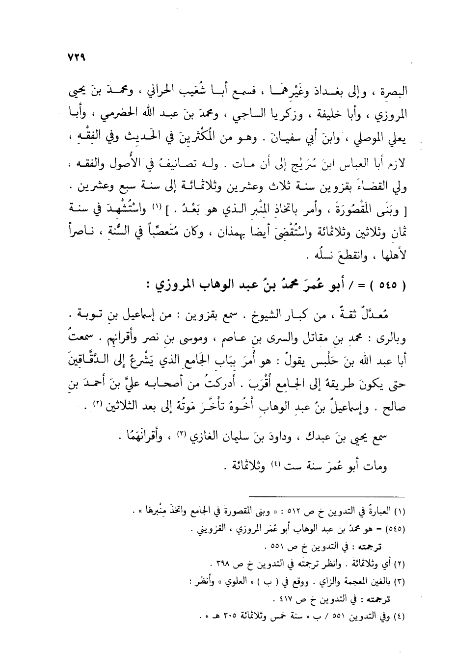§أَبُو عُمَرَ مُحَمَّدُ بْنُ عَبْدِ الْوَهَّابِ الْمَرْوَزِيُّ مُعَدَّلٌ، ثِقَةٌ، مِنْ كِبَارِ الشُّيُوخِ، سَمِعَ بِقَزْوِينَ مِنْ إِسْمَاعِيلَ بْنِ تَوْبَةِ، وَبِالرَّيِّ مُحَمَّدَ بْنَ مُقَاتِلٍ، وَالسَّرِيَّ بْنَ عَاصِمٍ، وَمُوسَى بْنَ نَصْرٍ، وَأَقْرَانَهُمْ. سَمِعْتُ أَبَا عَبْدِ اللَّهِ بْنَ حَلْبَسٍ يَقُولُ: هُوَ أَمَرَ بِبَابِ الْجَامِعِ الَّذِي يَشْرَعُ إِلَى الدَّقَّاقِينَ حَتَّى يَكُونَ طَرِيقُهُ إِلَى الْجَامِعِ أَقْرَبَ أَدْرَكْتُ مِنْ أَصْحَابِهِ عَلِيَّ بْنَ أَحْمَدَ بْنِ صَالِحٍ، وَإِسْمَاعِيلَ بْنَ عَبْدِ الْوَهَّابِ أَخُوهُ تَأَخَّرَ مَوْتُهُ إِلَى بَعْدِ الثَّلَاثِينَ سَمِعَ يَحْيَى بْنَ عَبْدَكَ، وَدَاوُدَ بْنَ سُلَيْمَانَ الْغَازِيَ وَأَقْرَانَهُمَا وَمَاتَ أَبُو عُمَرَ سَنَةَ سِتٍّ وَثَلَاثِمِائَةٍ
