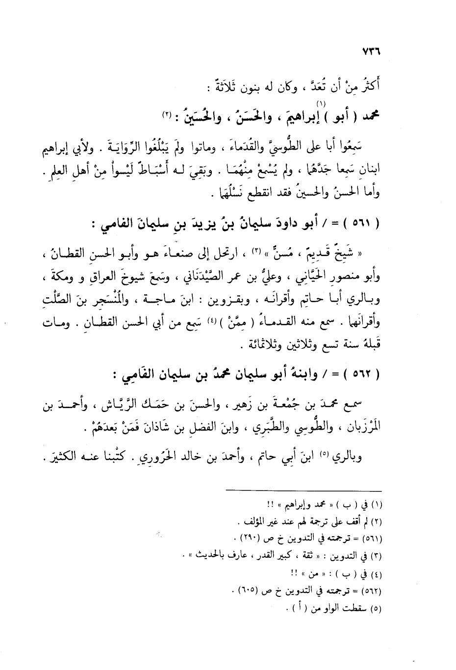 §وَابْنُهُ أَبُو سُلَيْمَانَ مُحَمَّدُ بْنُ سُلَيْمَانَ الْفَامِيُّ سَمِعَ مُحَمَّدَ بْنَ جُمُعَةَ بْنِ زُهَيْرٍ وَالْحَسَنَ بْنَ حَمَكٍ الرِّيَاشَ، وَأَحْمَدَ بْنَ الْمَرْزُبَانِ، وَالطُّوسِيَّ، وَالطَّبَرِيَّ، وَابْنَ الْفَضْلِ بْنَ شَاذَانَ، فَمَنْ بَعْدَهُمْ وَبِالرَّيِّ ابْنَ أَبِي حَاتِمٍ، وَأَحْمَدَ بْنَ خَالِدٍ الْحَرُورِيَّ، كَتَبْنَا عَنْهُ الْكَثِيرَ -[737]-، وَوُلِدَ سَنَةَ سَبْعٍ وَتِسْعِينَ وَمِائَتَيْنِ وَمَاتَ أَوَّلَ سَنَةِ سِتٍّ وَثَمَانِينَ وَثَلَاثِمِائَةٍ وَكَانَ لَهُ ابْنٌ لَمْ يَكُنْ مِنْ أَهْلِ الْعِلْمِ مَاتَ بَعْدَهُ بِثَلَاثِ سِنِينَ وَقَدِ انْقَطَعَ