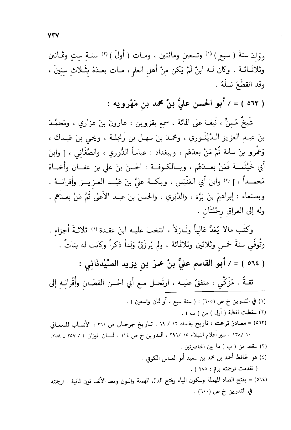 §أَبُو الْحَسَنِ عَلِيُّ بْنُ مُحَمَّدِ بْنِ مَهْرَوَيْهِ شَيْخٌ، مُسِنٌّ، نَيَّفَ عَلَى الْمِائَةِ سَمِعَ بِقَزْوِينَ هَارُونَ بْنَ هَزَارِيَّ، وَمُحَمَّدَ بْنَ عَبْدِ الْعَزِيزِ الدَّيْنَوَرَيَّ، وَمُحَمَّدَ بْنَ سَهْلِ بْنِ زَنْجَلَةَ، وَيَحْيَى بْنَ عَبْدَكَ، وَعَمْرَو بْنَ سَلَمَةَ، ثُمَّ مَنْ بَعْدَهُمْ وَبِبَغْدَادَ عَبَّاسًا الدُّورِيَّ، وَالصَّغَانِيَّ، وَابْنَ أَبِي خَيْثَمَةَ، فَمَنْ بَعْدَهُمْ وَبِالْكُوفَةِ الْحَسَنَ بْنَ عَلِيِّ بْنِ عَفَّانَ، وَأَخَاهُ مُحَمَّدًا، وَابْنَ أَبِي الْعَنْبَسِ، وَبِمَكَّةَ عَلِيَّ بْنَ عَبْدِ الْعَزِيزِ، وَأَقْرَانَهُ، وَبِصَنْعَاءَ إِبْرَاهِيمَ بْنَ بَرَّةَ، وَالدَّبَرِيَّ، وَالْحَسَنَ بْنَ عَبْدِ الْأَعْلَى، ثُمَّ مَنْ بَعْدَهُمْ وَلَهُ إِلَى الْعِرَاقِ رِحْلَتَانِ وَكَتَبَ مَا لَا يُعَدُّ عَالِيًا وَنَازِلًا انْتَخَبَ عَلَيْهِ ابْنُ عُقْدَةَ ثَلَاثَةَ أَجْزَاءٍ وَتُوُفِّيَ سَنَةِ خَمْسٍ وَثَلَاثِينَ وَثَلَاثِمِائَةٍ وَلَمْ يُرْزَقْ وَلَدًا ذَكَرًا وَكَانَتْ لَهُ بَنَاتٌ