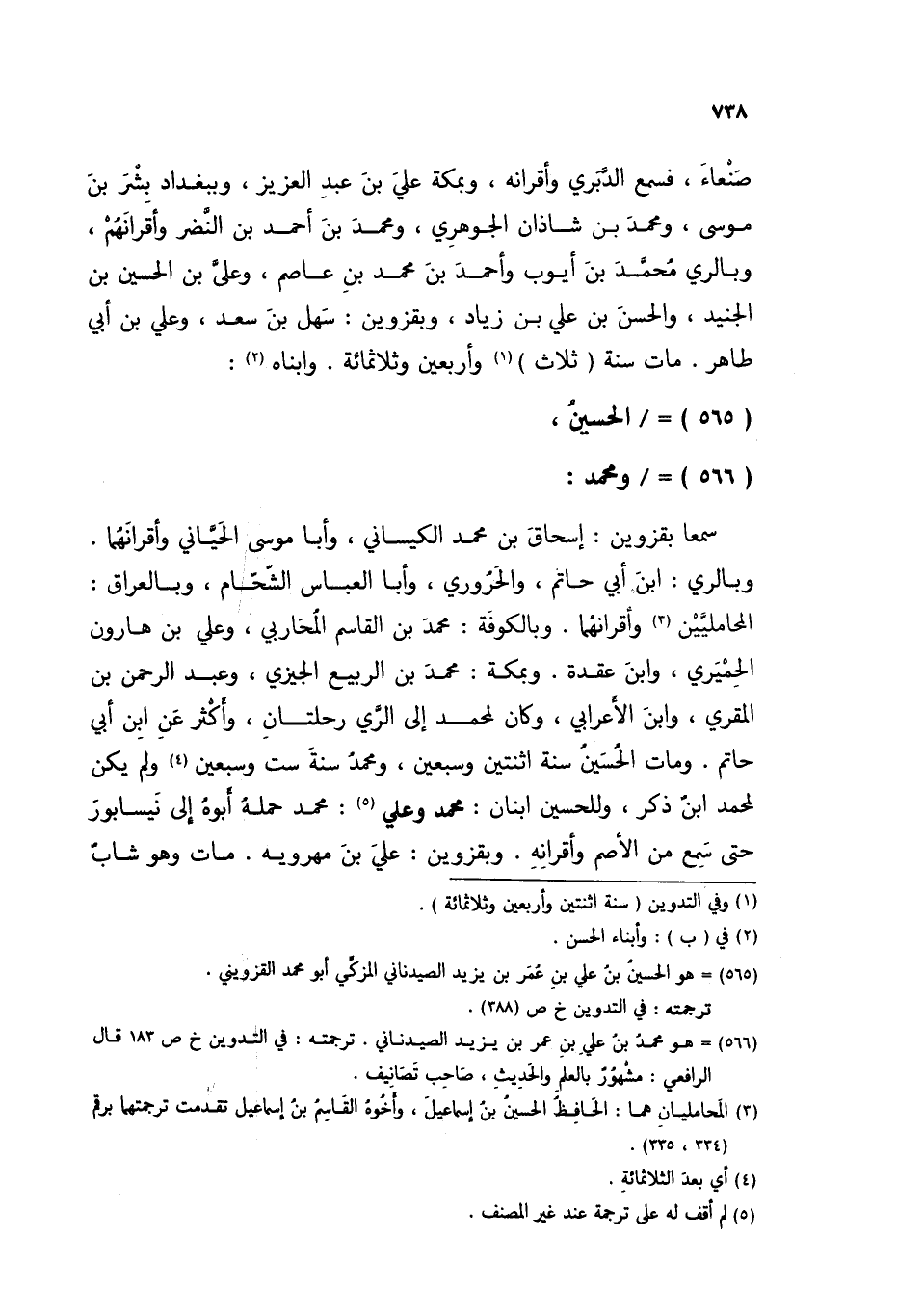 §الْحُسَيْنُ وَمُحَمَّدٌ سَمِعَا بِقَزْوِينَ إِسْحَاقَ بْنَ مُحَمَّدٍ الْكَيْسَانِيَّ، وَأَبَا مُوسَى الْحَيَّانِيَّ، وَأَقْرَانَهُمَا وَبِالرَّيِّ ابْنَ أَبِي حَاتِمٍ وَالْحَرُورِيَّ، وَأَبَا الْعَبَّاسِ الشَّحَّامَ، وَبِالْعِرَاقِ الْمَحَامِلِيِّينَ وَأَقْرَانَهُمَا، وَبِالْكُوفَةِ، مُحَمَّدَ بْنَ الْقَاسِمِ الْمُحَارِبِيَّ، وَعَلِيَّ بْنَ هَارُونَ الْحِمْيَرِيَّ، وَابْنَ عُقْدَةَ، وَبِمَكَّةَ مُحَمَّدَ بْنَ الرَّبِيعِ الْجِيزِيَّ، وَعَبْدَ الرَّحْمَنِ بْنَ الْمُقْرِيِّ، وَابْنَ الْأَعْرَابِيَّ، وَكَانَ لِمُحَمَّدٍ إِلَى الرَّيِّ رِحْلَتَانِ وَأَكْثَرَ عَنِ ابْنِ أَبِي حَاتِمٍ وَمَاتَ الْحُسَيْنُ سَنَةَ اثْنَتَيْنِ وَسَبْعِينَ وَمُحَمَّدٌ سَنَةَ سِتٍّ وَسَبْعِينَ وَلَمْ يَكُنْ لِمُحَمَّدٍ ابْنٌ ذَكَرٌ وَلِلْحُسَيْنِ ابْنَانِ: مُحَمَّدٌ، وَعَلِيٌّ مُحَمَّدٌ حَمَلَهُ أَبُوهُ إِلَى نَيْسَابُورَ حَتَّى سَمِعَ مِنَ الْأَصَمِّ وَأَقْرَانِهِ وَبِقَزْوِينَ، عَلِيَّ بْنَ مَهْرَوَيْهِ، مَاتَ وَهُوَ شَابٌّ
