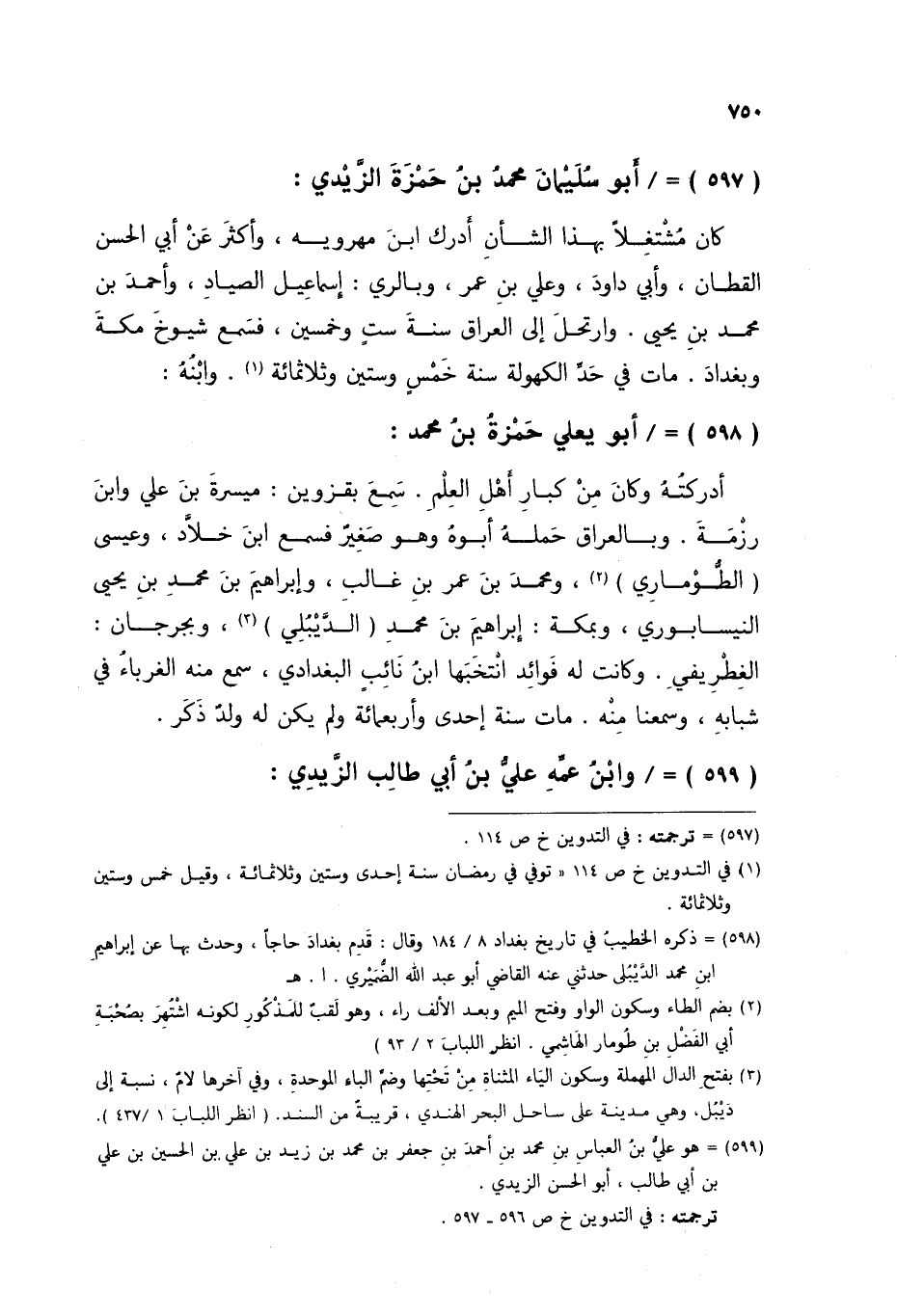 §أَبُو سُلَيْمَانَ مُحَمَّدُ بْنُ حَمْزَةَ الزَّيْدِيُّ كَانَ مُشْتَغِلًا بِهَذَا الشَّأْنِ أَدْرَكَ ابْنَ مَهْرَوَيْهِ، وَأَكْثَرَ عَنْ أَبِي الْحَسَنِ الْقَطَّانِ، وَأَبِي دَاوُدَ، وَعَلِيِّ بْنِ عُمَرَ، وَبِالرَّيِّ إِسْمَاعِيلَ الصَّيَّادَ، وَأَحْمَدَ بْنَ مُحَمَّدِ بْنِ يَحْيَى، وَارْتَحَلَ إِلَى الْعِرَاقِ سَنَةَ سِتٍّ وَخَمْسِينَ فَسَمِعَ شُيُوخَ مَكَّةَ وَبَغْدَادَ مَاتَ فِي حَدِّ الْكُهُولَةِ سَنَةَ خَمْسٍ وَسِتِّينَ وَثَلَاثِمِائَةٍ وَابْنُهُ: