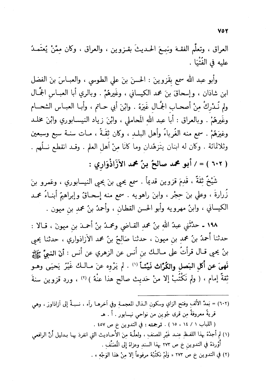 §أَبُو مُحَمَّدٍ صَالِحُ بْنُ مُحَمَّدٍ الْآزَاذْوَارِيَّ شَيْخٌ، ثِقَةٌ قَدِمَ قَزْوِينَ قَدِيمًا سَمِعَ يَحْيَى بْنَ يَحْيَى النَّيْسَابُورِيَّ، وَعَمْرَو بْنَ زُرَارَةَ، وَعَلِيَّ بْنَ حُجْرٍ، وَابْنَ رَاهَوَيْهِ، سَمِعَ مِنْهُ إِسْحَاقُ وَإِبْرَاهِيمُ أَبْنَاءُ مُحَمَّدٍ الْكَيْسَانِيُّ، وَابْنُ مَهْرَوَيْهِ، وَأَبُو الْحَسَنِ الْقَطَّانُ، وَأَحْمَدُ بْنُ مُحَمَّدِ بْنِ مَيْمُونٍ