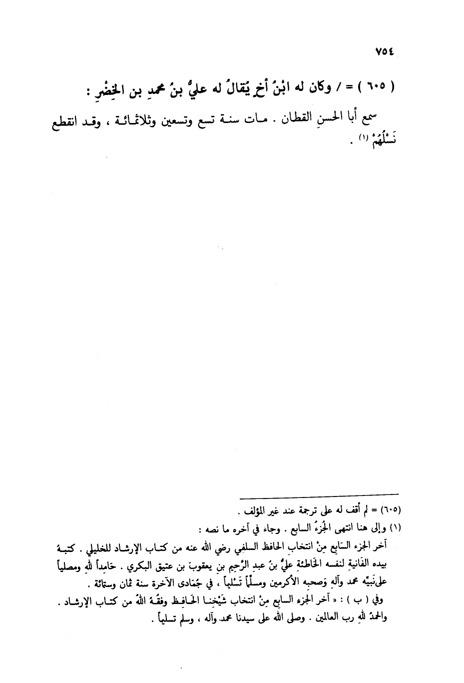§وَكَانَ لَهُ ابْنُ أَخٍ يُقَالُ لَهُ عَلِيُّ بْنُ مُحَمَّدِ بْنِ الْخَضِرِ سَمِعَ أَبَا الْحَسَنِ الْقَطَّانَ مَاتَ سَنَةَ تِسْعٍ وَتِسْعِينَ وَثَلَاثِمِائَةٍ وَقَدِ انْقَطَعَ نَسْلُهُمْ