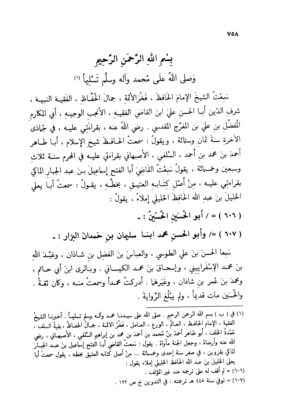 §أَبُو الْحُسَيْنِ الْحُسَيْنُ سَمِعْتُ الشَّيْخَ الْإِمَامَ الْحَافِظَ، فَخْرَ الْأَئِمَّةِ، جَمَالَ الْحُفَّاظِ الْفَقِيهَ النَّبِيهَ شَرَفَ الدِّينِ أَبَا الْحَسَنِ عَلِيَّ ابْنَ الْقَاضِي الْفَقِيهِ الْأَنْجَبِ الْوَجِيهِ أَبِي الْمَكَارِمِ الْمُفَضَّلِ بْنِ عَلِيِّ بْنِ الْمُفَرِّجِ الْمَقْدِسِيِّ رَضِيَ اللَّهُ عَنْهُ، بِقِرَاءَتِي عَلَيْهِ فِي جُمَادَى الْآخِرَةِ سَنَةَ ثَمَانٍ وَسِتِّمِائَةٍ، وَيَقُولُ: سَمِعْتُ الْحَافِظَ شَيْخَ الْإِسْلَامِ أَبَا طَاهِرٍ أَحْمَدَ بْنَ مُحَمَّدِ بْنِ أَحْمَدَ السِّلَفِيَّ الْأَصْبَهَانِيَّ، بِقِرَاءَتِي عَلَيْهِ فِي الْمُحَرَّمِ سَنَةَ ثَلَاثٍ وَسَبْعِينَ وَخَمْسِمِائَةٍ، يَقُولُ: سَمِعْتُ الْقَاضِي أَبَا الْفَتْحِ إِسْمَاعِيلَ بْنَ عَبْدِ الْجَبَّارِ الْمَاكِيَّ بِقِرَاءَتِي عَلَيْهِ، مِنْ أَصْلِ كِتَابِهِ الْعَتِيقِ بِخَطِّهِ، يَقُولُ: سَمِعْتُ أَبَا يَعْلَى الْخَلِيلَ بْنَ عَبْدِ اللَّهِ الْحَافِظَ الْخَلِيلِيَّ إِمْلَاءً، يَقُولُ: