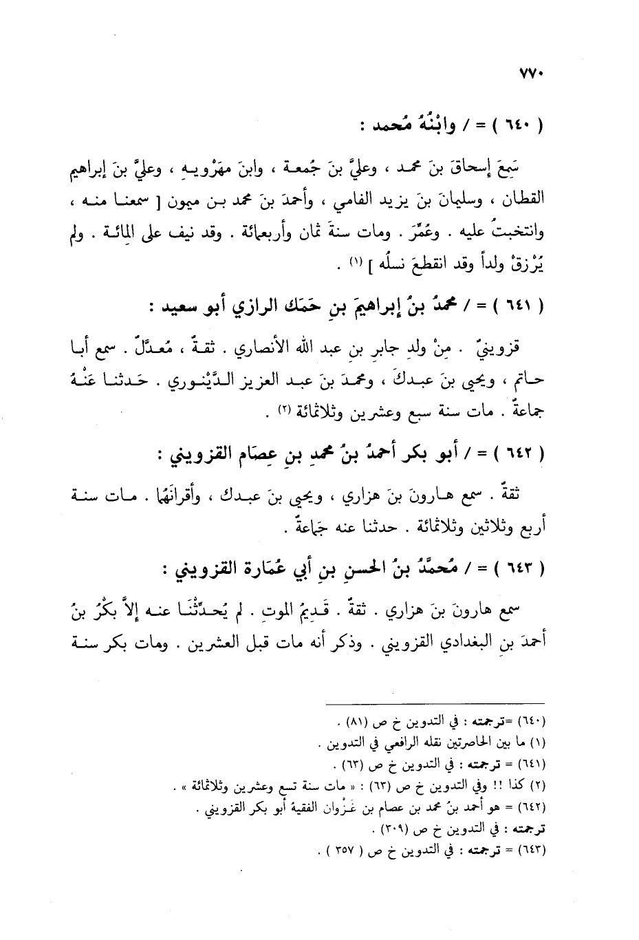 §أَبُو بَكْرٍ أَحْمَدُ بْنُ مُحَمَّدِ بْنِ عِصَامٍ الْقَزْوِينِيُّ ثِقَةٌ، سَمِعَ هَارُونَ بْنَ هَزَارِيٍّ، وَيَحْيَى بْنَ عَبْدَكَ، وَأَقْرَانَهُمَا، مَاتَ سَنَةَ أَرْبَعٍ وَثَلَاثِينَ وَثَلَاثِمِائَةٍ حَدَّثَنَا عَنْهُ جَمَاعَةٌ