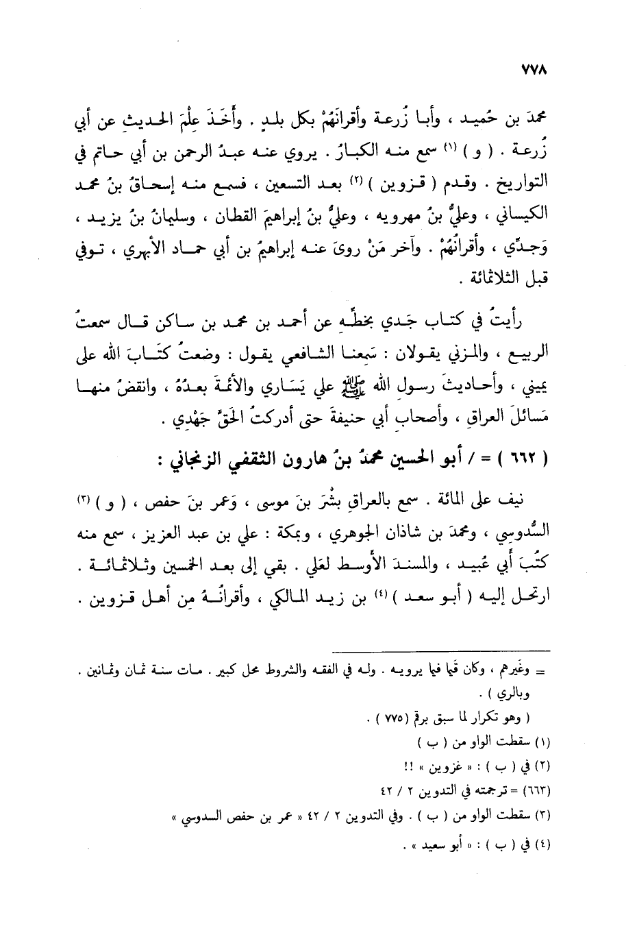§أَبُو الْحُسَيْنِ مُحَمَّدُ بْنُ هَارُونَ الثَّقَفِيُّ الزَّنْجَانِيُّ نَيَّفَ عَلَى الْمِائَةِ سَمِعَ بِالْعِرَاقِ بِشْرَ بْنَ مُوسَى، وَعُمَرَ بْنَ حَفْصٍ، وَالسَّدُوسِيَّ، وَمُحَمَّدَ بْنَ شَاذَانَ الْجَوْهَرِيَّ، وَبِمَكَّةَ عَلِيَّ بْنَ عَبْدِ الْعَزِيزِ سَمِعَ مِنْهُ كُتِبَ أَبِي عُبَيْدٍ، وَالْمُسْنَدَ الْأَوْسَطَ لِعَلِيٍّ، بَقِيَ إِلَى بَعْدَ الْخَمْسِينَ وَثَلَاثِمِائَةٍ ارْتَحَلَ إِلَيْهِ أَبُو سَعْدِ بْنُ زَيْدٍ الْمَالِكِيُّ، وَأَقْرَانَهُ مِنْ أَهْلِ قَزْوِينَ -[779]- وَزَكُّوهُ، وَآخِرُ مَنْ رَوَى عَنْهُ الْفَلَاكِيُّ