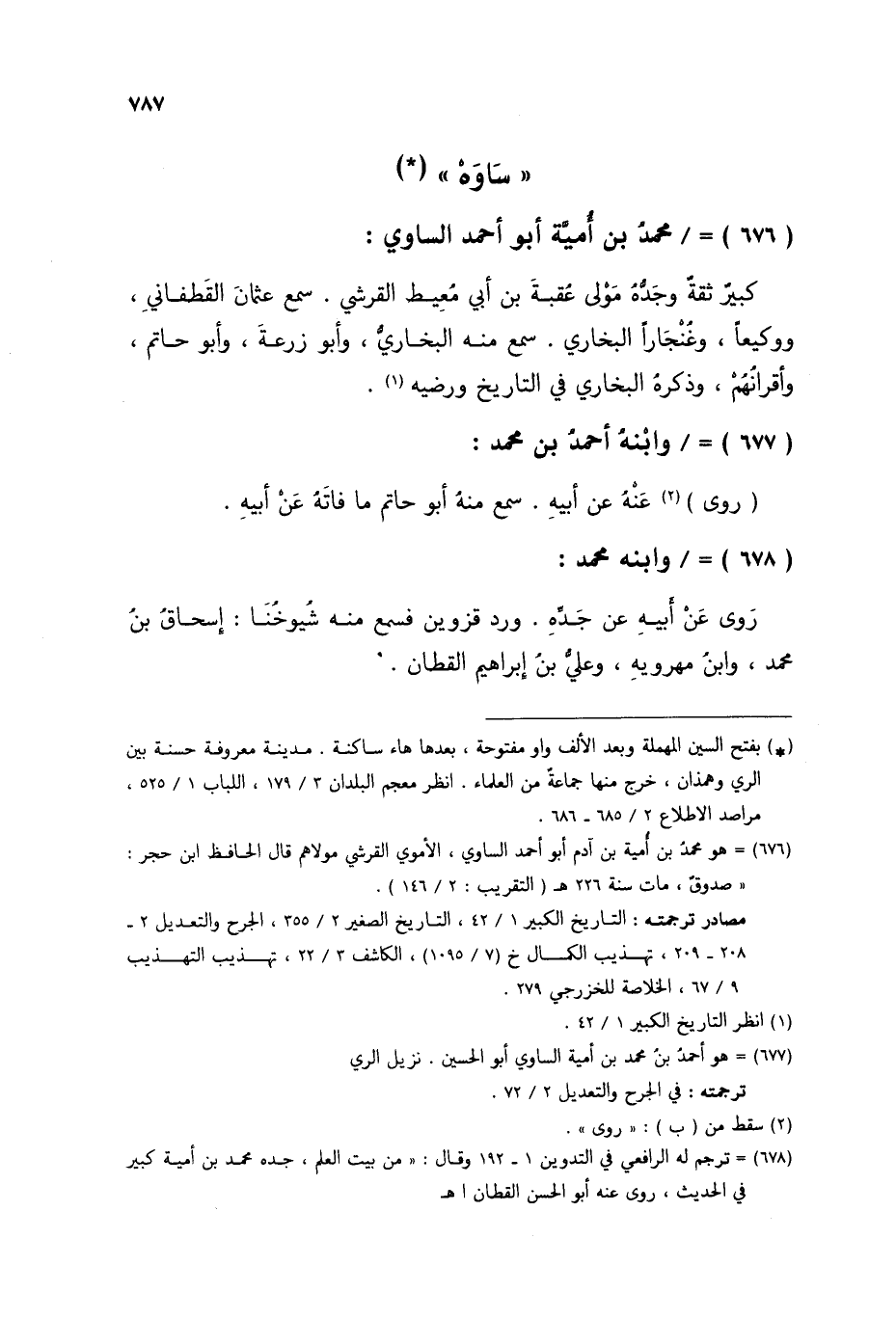 §مُحَمَّدُ بْنُ أُمَيَّةَ أَبُو أَحْمَدَ السَّاوِيُّ كَبِيرٌ، ثِقَةٌ، وَجَدَهُ مَوْلَى عُقْبَةَ بْنِ أَبِي مُعَيْطٍ الْقُرَشِيِّ سَمِعَ عُثْمَانَ الْقَطَفَانِيَّ، وَوَكِيعًا، وَغُنْجَارًا الْبُخَارِيَّ، سَمِعَ مِنْهُ الْبُخَارِيُّ، وَأَبُو زُرْعَةَ، وَأَبُو حَاتِمٍ، وَأَقْرَانُهُمْ، وَذَكَرَهُ الْبُخَارِيُّ فِي التَّارِيخِ وَرَضِيَهُ