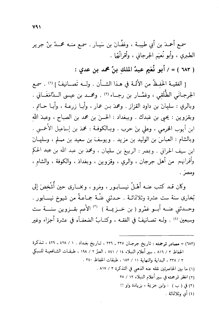 §أَبُو نُعَيْمٍ عَبْدُ الْمَلِكِ بْنُ مُحَمَّدِ بْنِ عَدِيٍّ الْفَقِيهُ الْحَفِظُ مِنَ الْأَئِمَّةِ فِي هَذَا الشَّأْنِ، وَلَهُ تَصَانِيفُ سَمِعَ الْجُرْجَانِيَّ الطُّلَقِيَّ، وَعَمَّارَ بْنَ رَجَاءٍ، وَمُحَمَّدَ بْنَ عِيسَى الدَّامِغَانِيَّ، وَبِالرَّيِّ سُلَيْمَانَ بْنَ دَاوُدَ الْقَزَّازَ، وَمُحَمَّدَ بْنَ عَمَّارٍ، وَأَبَا زُرْعَةَ، وَأَبَا حَاتِمٍ، وَبِقَزْوِينَ يَحْيَى بْنَ عَبْدَكَ، وَبِبَغْدَادَ الْحَسَنَ بْنَ مُحَمَّدِ بْنِ الصَّبَّاحِ، وَعَبْدَ اللَّهِ بْنَ أَيُّوبَ الْمُخَرِّمِيَّ، وَعَلِيَّ بْنَ حَرْبٍ وَبِالْكُوفَةِ مُحَمَّدَ بْنَ إِسْمَاعِيلَ الْأَخْمَسِيَّ، وَبِالشَّامِ الْعَبَّاسَ بْنَ الْوَلِيدِ بْنِ مَزْيَدٍ، وَيُوسُفَ بْنَ سَعِيدِ بْنِ مُسْلِمٍ، وَسُلَيْمَانَ بْنَ سَيْفٍ الْحَرَّانِيَّ، وَبِمِصْرَ الرَّبِيعَ بْنَ سُلَيْمَانَ، وَمُحَمَّدَ بْنَ عَبْدِ اللَّهِ بْنِ عَبْدِ الْحَكَمِ، وَأَقْرَانَهُمْ مِنْ أَهْلِ جُرْجَانَ، وَالرَّيِّ، وَقَزْوِينَ، وَبَغْدَادَ، وَالْكُوفَةِ، وَالشَّامِ، وَمِصْرَ، وَكَانَ قَدْ كَتَبَ عَنْهُ أَهْلُ نَيْسَابُورَ، وَمَرْوَ، وَبُخَارَى حِينَ أَشْخَصَ إِلَى بُخَارَى سَنَةَ سِتَّ عَشْرَةَ وَثَلَاثِمِائَةٍ حَدَّثَنِي عَنْهُ جَمَاعَةٌ مِنْ شُيُوخِ نَيْسَابُورَ وَحَدَّثَنِي عَنْهُ أَبُو عَمْرٍو بْنُ خُزَيْمَةَ الْأَصَمُّ بِقَزْوِينَ سَنَةَ سِتٍّ وَسَبْعِينَ وَلَهُ تَصَانِيفُ فِي الْفِقْهِ، وَكِتَابُ الضُّعَفَاءِ فِي عَشْرَةِ أَجْزَاءَ وَغَيْرِ