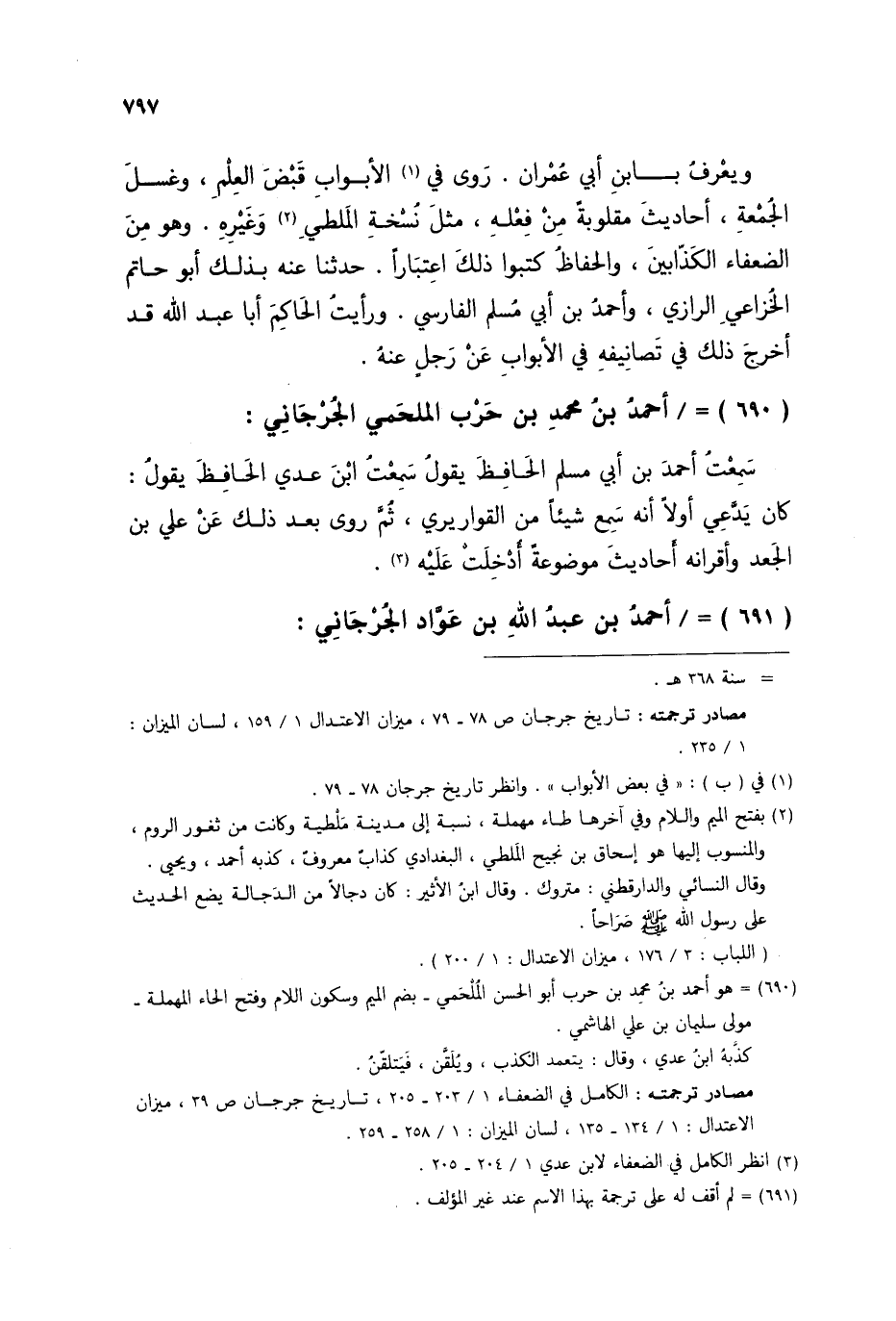 §أَحْمَدُ بْنُ مُحَمَّدِ بْنِ حَرْبٍ الْمَلْحَمِيُّ الْجُرْجَانِيُّ سَمِعْتُ أَحْمَدَ بْنَ أَبِي مُسْلِمٍ الْحَافِظَ، يَقُولُ: سَمِعْتُ ابْنَ عَدِيٍّ الْحَافِظَ، يَقُولُ: كَانَ يَدَّعِي أَوَّلًا أَنَّهُ سَمِعَ شَيْئًا مِنَ الْقَوَارِيرِيِّ، ثُمَّ رَوَى بَعْدَ ذَلِكَ عَنْ عَلِيِّ بْنِ الْجَعْدِ، وَأَقْرَانِهِ أَحَادِيثَ مَوْضُوعَةً أُدْخِلَتْ عَلَيْهِ