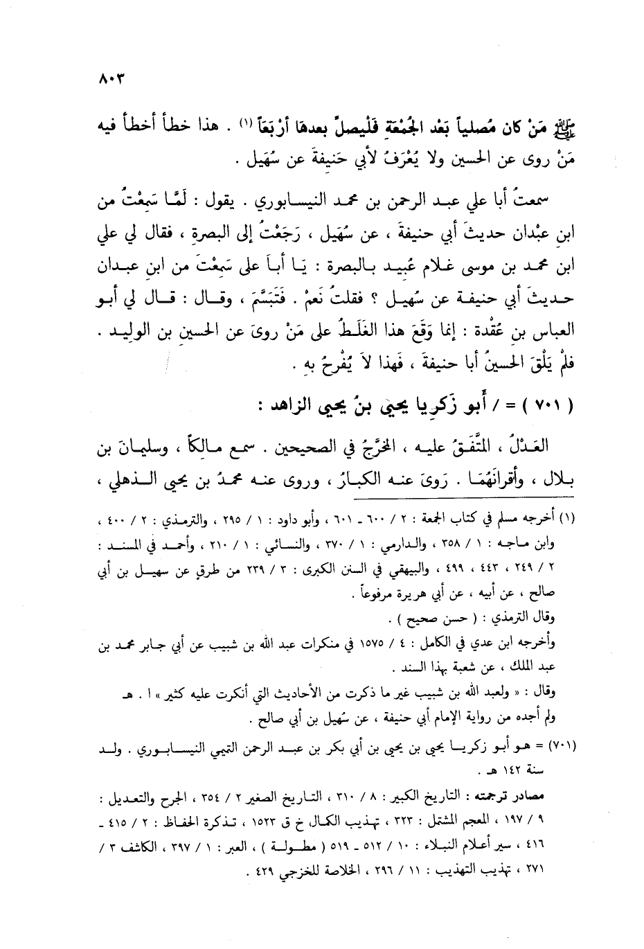§أَبُو زَكَرِيَّا يَحْيَى بْنُ يَحْيَى الزَّاهِدُ الْعَدْلُ، الْمُتَّفَقُ عَلَيْهِ، الْمُخَرَّجُ فِي الصَّحِيحَيْنِ سَمِعَ مَالِكًا، وَسُلَيْمَانَ بْنَ بِلَالٍ، وَأَقْرَانَهُمَا، رَوَى عَنْهُ الْكِبَارُ، وَرَوَى عَنْهُ مُحَمَّدُ بْنُ يَحْيَى الذُّهْلِيُّ -[804]-، وَالْبُخَارِيُّ، وَأَكْثَرَ عَنْهُ فِي الصَّحِيحِ وَمُسْلِمُ بْنُ الْحَجَّاجِ، وَمَنْ بَعْدَهُمْ مِنْ حُفَّاظِ الْحَدِيثِ، مَاتَ سَنَةَ نَيِّفٍ وَعِشْرِينَ، وَقَالَ السَّرَّاجُ: حَضَرْتُ عِنْدَهُ وَأَنَا صَغِيرٌ، وَقُرِئَ عَلَيْهِ، وَلَكِنِّي لَمْ أَضْبِطْ فَلَمْ أَرْوِ عَنْهُ. حَدَّثَنِي أَحْمَدُ بْنُ مُحَمَّدِ بْنِ عُمَرَ الزَّاهِدُ بِنَيْسَابُورَ، حَدَّثَنَا مُحَمَّدُ بْنُ إِسْحَاقَ الثَّقَفِيُّ، حَدَّثَنَا إِسْحَاقُ بْنُ إِبْرَاهِيمَ شَاهِنْشَاهُ، حَدَّثَنَا يَحْيَى بْنُ يَحْيَى، وَكَانَ عَاقِلًا