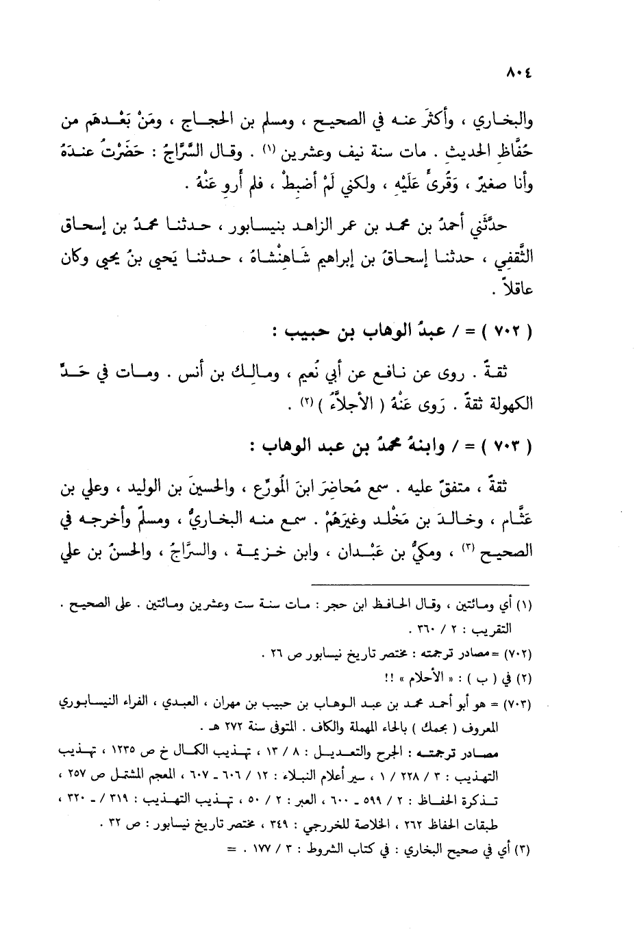 §عَبْدُ الْوَهَّابِ بْنُ حَبِيبٍ ثِقَةٌ، رَوَى عَنْ نَافِعٍ عَنْ أَبِي نُعَيْمٍ، وَمَالِكِ بْنِ أَنَسٍ، وَمَاتَ فِي حَدِّ الْكُهُولَةِ، ثِقَةٌ رَوَى عَنْهُ الْأَجِلَّاءُ