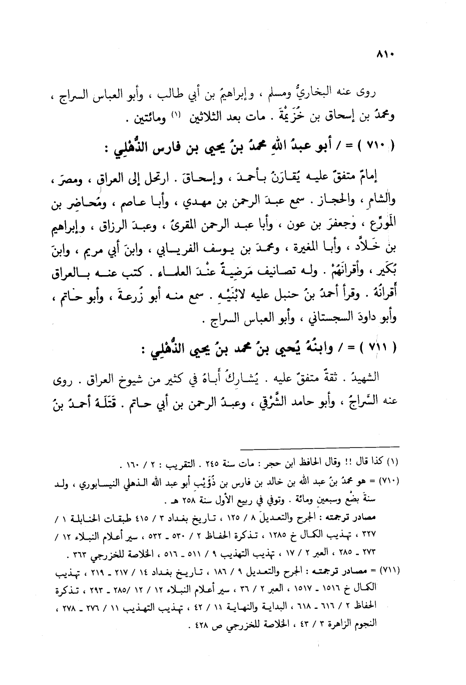 §أَبُو عَبْدِ اللَّهِ مُحَمَّدُ بْنُ يَحْيَى بْنِ فَارِسٍ الذُّهْلِيَّ إِمَامٌ، مُتَّفَقٌ عَلَيْهِ يُقَارَنُ بِأَحْمَدَ، وَإِسْحَاقَ، ارْتَحَلَ إِلَى الْعِرَاقِ، وَمِصْرَ، وَالشَّامِ، وَالْحِجَازِ، سَمِعَ عَبْدَ الرَّحْمَنِ بْنَ مَهْدِيٍّ، وَأَبَا عَاصِمٍ، وَمُحَاضِرَ بْنَ الْمُوَرِّعِ، وَجَعْفَرَ بْنَ عَوْنٍ، وَأَبَا عَبْدِ الرَّحْمَنِ الْمُقْرِئَ، وَعَبْدَ الرَّزَّاقِ، وَإِبْرَاهِيمَ بْنَ خَلَّادٍ، وَأَبَا الْمُغِيرَةِ، وَمُحَمَّدَ بْنَ يُوسُفَ الْفِرْيَابِيَّ، وَابْنَ أَبِي مَرْيَمَ، وَابْنَ بُكَيْرٍ، وَأَقْرَانَهُمْ، وَلَهُ تَصَانِيفُ مُرْضِيَةٌ عِنْدَ الْعُلَمَاءِ، كَتَبَ عَنْهُ بِالْعِرَاقِ أَقْرَانُهُ وَقَرَأَ أَحْمَدُ بْنُ حَنْبَلٍ عَلَيْهِ لِابْنَيْهِ، سَمِعَ مِنْهُ أَبُو زُرْعَةَ، وَأَبُو حَاتِمٍ، وَأَبُو دَاوُدَ السِّجِسْتَانِيُّ، وَأَبُو الْعَبَّاسِ السَّرَّاجُ