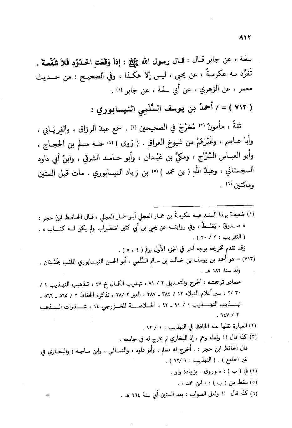 §أَحْمَدُ بْنُ يُوسُفَ السُّلَمِيُّ النَّيْسَابُورِيُّ ثِقَةٌ، مَأْمُونٌ، مُخَرَّجٌ فِي الصَّحِيحَيْنِ سَمِعَ عَبْدَ الرَّزَّاقِ، وَالْفِرْيَابِيَّ، وَأَبَا عَاصِمٍ، وَغَيْرَهُمْ مِنْ شُيُوخِ الْعِرَاقِ، رَوَى عَنْهُ مُسْلِمُ بْنُ الْحَجَّاجِ، وَأَبُو الْعَبَّاسِ السَّرَّاجُ، وَمَكِّيُّ بْنُ عَبْدَانَ وَأَبُو حَامِدٍ الشَّرْقِيُّ، وَابْنُ أَبِي دَاوُدَ السِّجِسْتَانِيُّ، وَعَبْدُ اللَّهِ بْنُ مُحَمَّدِ بْنِ زِيَادٍ النَّيْسَابُورِيُّ، مَاتَ قَبْلَ السِّتِّينَ وَمِائَتَيْنِ