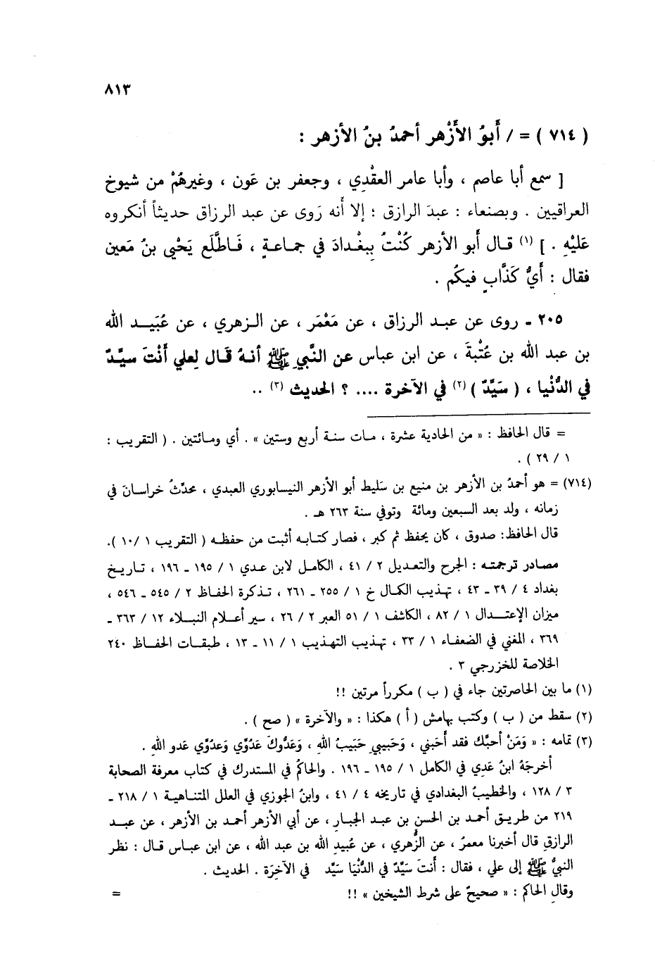 §أَبُو الْأَزْهَرِ أَحْمَدُ بْنُ الْأَزْهَرِ سَمِعَ أَبَا عَاصِمٍ، وَأَبَا عَامِرٍ الْعَقَدِيَّ، وَجَعْفَرَ بْنَ عَوْنٍ، وَغَيْرَهُمْ مِنْ شُيُوخِ الْعِرَاقِيِّينَ وَبِصَنْعَاءَ عَبْدَ الرَّزَّاقِ، إِلَّا أَنَّهُ رَوَى عَنْ عَبْدِ الرَّزَّاقِ حَدِيثًا أَنْكَرُوهُ عَلَيْهِ قَالَ أَبُو الْأَزْهَرِ كُنْتُ بِبَغْدَادَ فِي جَمَاعَةٍ فَاطَّلَعَ يَحْيَى بْنُ مَعِينٍ فَقَالَ: أَيُّ كَذَّابٍ فِيكُمْ رَوَى عَنْ عَبْدِ الرَّزَّاقِ عَنْ مَعْمَرٍ عَنِ الزُّهْرِيِّ، عَنْ عُبَيْدِ اللَّهِ بْنِ عَبْدِ اللَّهِ بْنِ عُتْبَةَ، عَنِ ابْنِ عَبَّاسٍ، عَنِ النَّبِيِّ صَلَّى اللهُ عَلَيْهِ وَسَلَّمَ أَنَّهُ قَالَ لِعَلِيٍّ «أَنْتَ سَيِّدٌ فِي الدُّنْيَا سَيِّدٌ فِي الْآخِرَةِ» الْحَدِيثَ؟