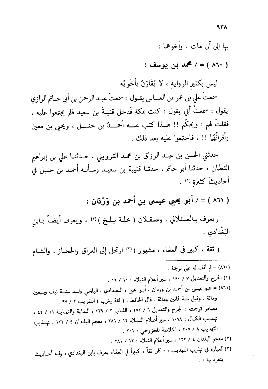 §مُحَمَّدُ بْنُ يُوسُفَ لَيْسَ بِكَثِيرِ الرِّوَايَةِ، لَا يُقَارَنُ بِأَخَوَيْهِ، سَمِعْتُ عَلِيَّ بْنَ عُمَرَ بْنِ الْعَبَّاسِ يَقُولُ: سَمِعْتُ عَبْدَ الرَّحْمَنِ بْنَ أَبِي حَاتِمٍ الرَّازِيُّ، يَقُولُ: سَمِعْتُ أَبِي يَقُولُ: كُنْتُ بِمَكَّةَ، فَدَخَلَ قُتَيْبَةُ بْنُ سَعِيدٍ، فَلَمْ يَجْتَمِعُوا عَلَيْهِ، فَقُلْتُ لَهُمْ: وَيْحَكُمْ هَذَا كَتَبَ عَنْهُ أَحْمَدُ بْنُ حَنْبَلٍ، وَيَحْيَى بْنُ مَعِينٍ، وَأَقْرَانُهُمَا، فَاجْتَمَعُوا عَلَيْهِ بَعْدَ ذَلِكَ، حَدَّثَنِي الْحَسَنُ بْنُ عَبْدِ الرَّزَّاقِ بْنِ مُحَمَّدٍ الْقَزْوِينِيُّ، حَدَّثَنَا عَلِيُّ بْنُ إِبْرَاهِيمَ الْقَطَّانُ، حَدَّثَنَا أَبُو حَاتِمٍ، حَدَّثَنَا قُتَيْبَةُ بْنُ سَعِيدٍ، وَسَأَلَهُ أَحْمَدُ بْنُ حَنْبَلٍ فِي أَحَادِيثَ كَثِيرَةٍ