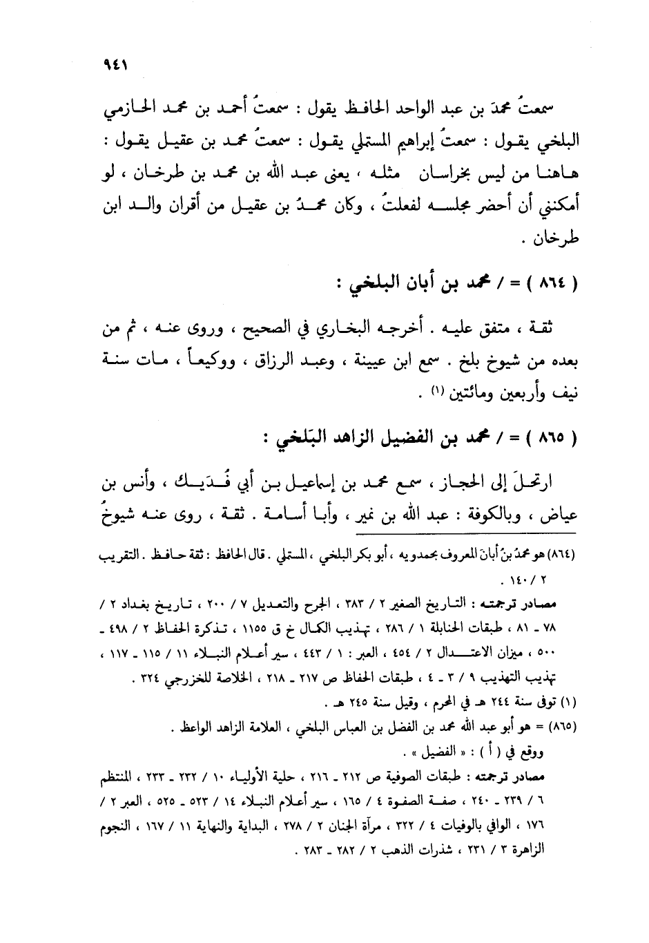 §مُحَمَّدُ بْنُ الْفُضَيْلِ الزَّاهِدُ الْبَلْخِيُّ ارْتَحَلَ إِلَى الْحِجَازِ، سَمِعَ مُحَمَّدَ بْنَ إِسْمَاعِيلَ بْنِ أَبِي فُدَيْكٍ، وَأَنَسَ بْنَ عِيَاضٍ، وَبِالْكُوفَةِ عَبْدَ اللَّهِ بْنَ نُمَيْرٍ، وَأَبَا أُسَامَةَ، ثِقَةٌ، رَوَى عَنْهُ شُيُوخُ -[942]- بَلْخَ: عِيسَى بْنُ أَحْمَدَ، وَأَبُو بَكْرٍ الذَّهَبِيُّ، وَأَخُوهُ أَبُو سَعِيدٍ، وَآخِرُ مَنْ رَوَى عَنْهُ عَلِيُّ بْنُ أَحْمَدَ الْفَارِسِيُّ الْبَلْخِيُّ، تُوُفِّيَ سَنَةَ ثَمَانٍ وَخَمْسِينَ وَمِائَتَيْنِ