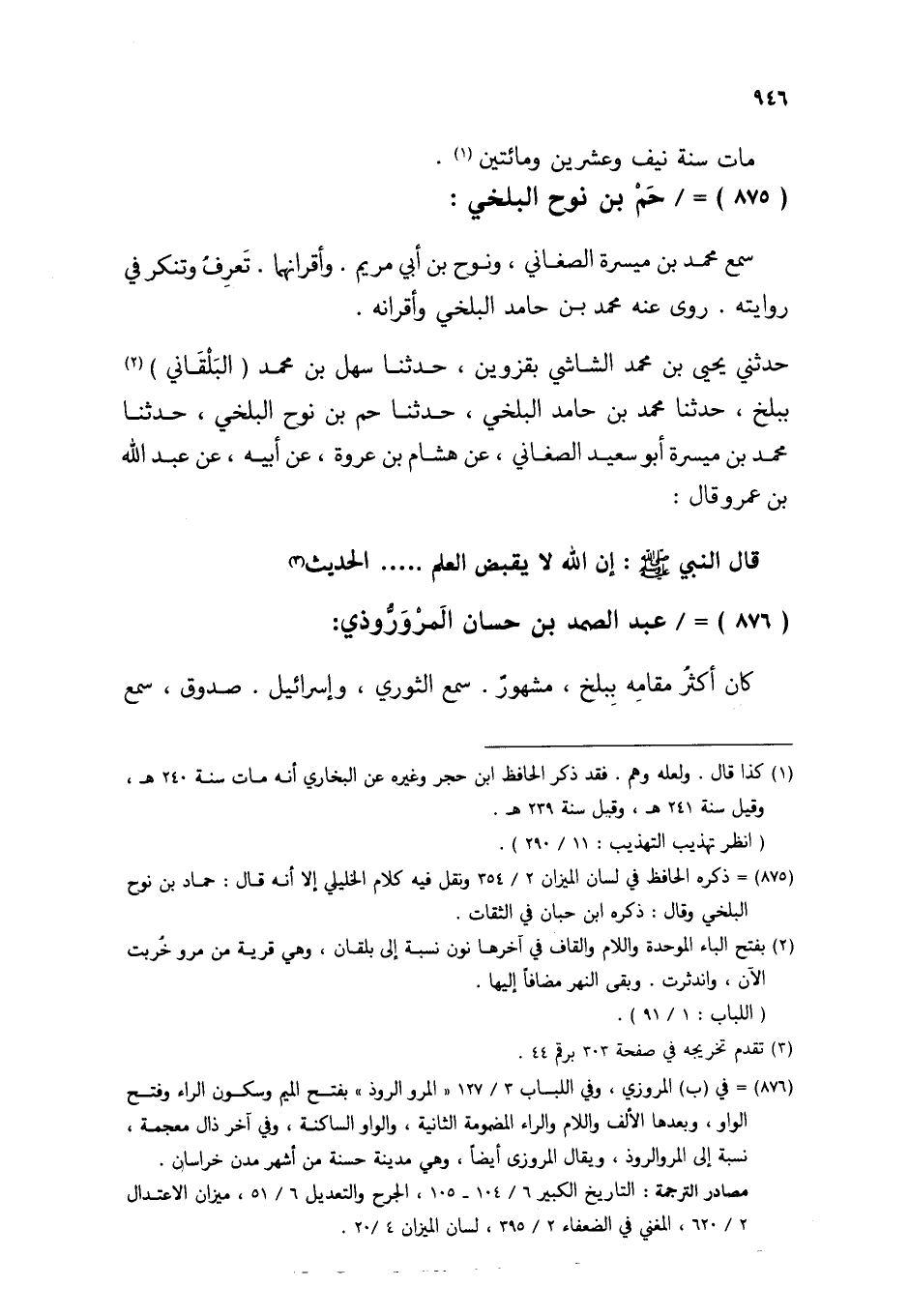§حَمْ بْنُ نُوحٍ الْبَلْخِيُّ سَمِعَ مُحَمَّدَ بْنَ مَيْسَرَةَ الصَّغَانِيَّ، وَنُوحَ بْنَ أَبِي مَرْيَمَ، وَأَقْرَانَهُمَا، تَعْرِفُ، وَتُنْكِرُ فِي رِوَايَتِهِ، رَوَى عَنْهُ مُحَمَّدُ بْنُ حَامِدٍ الْبَلْخِيُّ، وَأَقْرَانُهُ، حَدَّثَنِي يَحْيَى بْنُ مُحَمَّدٍ الشَّاشِيُّ، بِقَزْوِينَ، حَدَّثَنَا سَهْلُ بْنُ مُحَمَّدٍ الْبَلْقَانِيُّ بِبَلْخَ، حَدَّثَنَا مُحَمَّدُ بْنُ حَامِدٍ الْبَلْخِيُّ، حَدَّثَنَا حَمْ بْنُ نُوحٍ الْبَلْخِيُّ، حَدَّثَنَا مُحَمَّدُ بْنُ مَيْسَرَةَ أَبُو سَعِيدٍ الصَّغَانِيُّ، عَنْ هِشَامِ بْنِ عُرْوَةَ، عَنْ أَبِيهِ، عَنْ عَبْدِ اللَّهِ بْنِ عَمْرٍو، وَقَالَ: قَالَ النَّبِيُّ صَلَّى اللهُ عَلَيْهِ وَسَلَّمَ: «إِنَّ اللَّهَ لَا يَقْبِضُ الْعِلْمَ» الْحَدِيثُ