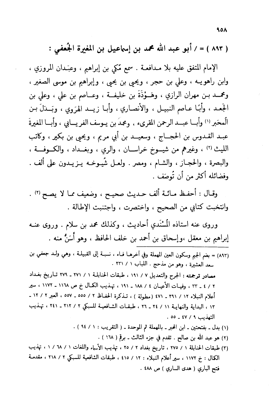 §أَبُو عَبْدِ اللَّهِ مُحَمَّدُ بْنُ إِسْمَاعِيلَ بْنِ الْمُغِيرَةِ الْجُعْفِيُّ الْإِمَامُ، الْمُتَّفَقُ عَلَيْهِ بِلَا مُدَافَعَةٍ، سَمِعَ مَكِّيَّ بْنَ إِبْرَاهِيمَ، وَعَبْدَانَ الْمَرْوَزِيَّ، وَابْنَ رَاهَوَيْهِ، وَعَلِيَّ بْنَ حُجْرٍ، وَيَحْيَى بْنَ يَحْيَى، وَإِبْرَاهِيمَ بْنَ مُوسَى الصَّغِيرَ، وَمُحَمَّدَ بْنَ مِهْرَانَ الرَّازِيَّ، وَهَوْذَةَ بْنَ خَلِيفَةَ، وَعَاصِمَ بْنَ عَلِيٍّ، وَعَلِيَّ بْنَ الْجَعْدِ، وَأَبَا عَاصِمٍ النَّبِيلَ، وَالْأَنْصَارِيَّ، وَأَبَا زَيْدٍ الْهَرَوِيَّ، وَبَدَلَ بْنَ الْمُحَبَّرِ، وَأَبَا عَبْدِ الرَّحْمَنِ الْمُقْرِئَ، وَمُحَمَّدَ بْنَ يُوسُفَ الْفِرْيَابِيَّ، وَأَبَا الْمُغِيرَةِ عَبْدَ الْقُدُّوسِ بْنَ الْحَجَّاجِ، وَسَعِيدَ بْنَ أَبِي مَرْيَمَ، وَيَحْيَى بْنَ بُكَيْرٍ، وَكَاتِبَ اللَّيْثِ، وَغَيْرَهُمْ مِنْ شُيُوخِ خُرَاسَانَ، وَالرَّيَّ، وَبَغْدَادَ، وَالْكُوفَةِ، وَالْبَصْرَةِ، وَالْحِجَازِ، وَالشَّامِ، وَمِصْرَ، وَلَعَلَّ شُيُوخَهُ يَزِيدُونَ عَلَى أَلْفٍ، وَفَضَائِلُهُ أَكْثَرُ مِنْ أَنْ تُوصَفَ، وَقَالَ: أَحْفَظُ مِائَةَ أَلْفِ حَدِيثٍ صَحِيحٍ وَضَعِيفٍ مِمَّا لَا يَصِحُّ، وَانْتَخَبْتُ كِتَابِي مِنَ الصَّحِيحِ، وَاخْتَصَرْتُ وَاجْتَنَبْتُ الْإِطَالَةَ، وَرَوَى عَنْهُ أُسْتَاذُهُ الْمُسْنَدِيُّ أَحَادِيثَ، وَكَذَلِكَ مُحَمَّدُ بْنُ سَلَّامٍ، وَرَوَى عَنْهُ إِبْرَاهِيمُ بْنُ مَعْقِلٍ، وَإِسْحَاقُ بْنُ أَحْمَدَ بْنِ خَلَفٍ الْحَافِظُ، وَهُوَ أَسَنُّ مِنْهُ