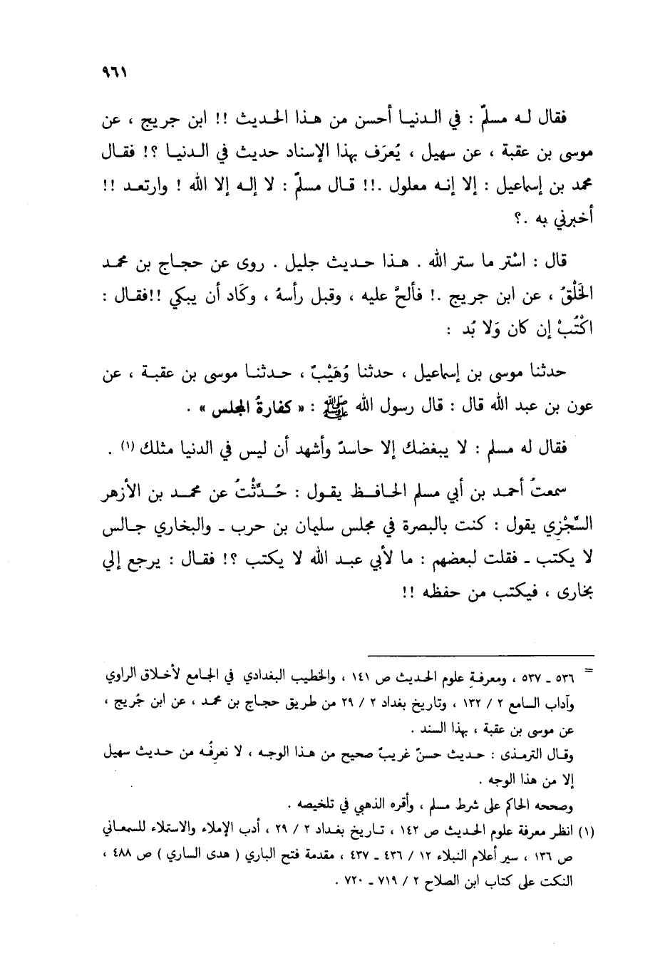 فَقَالَ لَهُ مُسْلِمٌ: فِي الدُّنْيَا أَحْسَنُ مِنْ هَذَا الْحَدِيثِ ابْنُ جُرَيْجٍ عَنْ مُوسَى بْنِ عُقْبَةَ عَنْ سُهَيْلٍ يُعْرَفُ بِهَذَا الْإِسْنَادِ حَدِيثٌ فِي الدُّنْيَا؟ فَقَالَ مُحَمَّدُ بْنُ إِسْمَاعِيلَ: إِلَّا أَنَّهُ مَعْلُولٌ، قَالَ مُسْلِمٌ لَا إِلَهَ إِلَّا اللَّهُ، وَارْتَعَدَ، أَخْبَرَنِي بِهِ؟ قَالَ: اسْتُرْ مَا سَتَرَ اللَّهُ، هَذَا حَدِيثٌ جَلِيلٌ رُوِيَ عَنْ حَجَّاجِ بْنِ مُحَمَّدٍ، الْخَلْقُ، عَنِ ابْنِ جُرَيْجٍ، فَأَلَحَّ عَلَيْهِ وَقَبَّلَ رَأْسَهُ وَكَادَ أَنْ يَبْكِيَ، فَقَالَ: اكْتُبْ إِنْ كَانَ وَلَا بُدَّ، حَدَّثَنَا مُوسَى بْنُ إِسْمَاعِيلَ حَدَّثَنَا وُهَيْبٌ، حَدَّثَنَا مُوسَى بْنُ عُقْبَةَ عَنْ عَوْنِ بْنِ عَبْدِ اللَّهِ قَالَ: قَالَ رَسُولُ اللَّهِ صَلَّى اللهُ عَلَيْهِ وَسَلَّمَ «كَفَّارَةُ الْمَجْلِسِ» فَقَالَ لَهُ مُسْلِمٌ: لَا يُبْغِضُكَ إِلَّا حَاسِدٌ، وَأَشْهَدُ أَنْ لَيْسَ فِي الدُّنْيَا مِثْلُكَ، سَمِعْتُ أَحْمَدَ بْنَ أَبِي مُسْلِمٍ الْحَافِظَ، يَقُولُ: حُدِّثْتُ عَنْ مُحَمَّدِ بْنِ الْأَزْهَرِ السِّجْزِيِّ يَقُولُ: كُنْتُ بِالْبَصْرَةِ فِي مَجْلِسِ سُلَيْمَانَ بْنِ حَرْبٍ، وَالْبُخَارِيُّ جَالِسٌ لَا يَكْتُبُ، فَقُلْتُ لِبَعْضِهِمْ: مَا لِأَبِي عَبْدِ اللَّهِ لَا يَكْتُبُ؟ فَقَالَ: يَرْجِعُ إِلَى بُخَارَى فَيَكْتُبُ مِنْ حِفْظِهِ