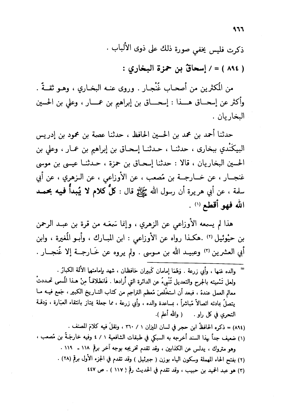 حَدَّثَنَا أَحْمَدُ بْنُ مُحَمَّدِ بْنِ الْحُسَيْنِ الْحَافِظُ، حَدَّثَنَا عِصْمَةُ بْنُ مَحْمُودِ بْنِ إِدْرِيسَ الْبِيكَنْدِيُّ بِبُخَارَى، حَدَّثَنَا إِسْحَاقُ بْنُ إِبْرَاهِيمَ بْنِ عَمَّارٍ، وَعَلِيُّ بْنُ الْحُسَيْنِ الْبُخَارِيَّانِ، قَالَا: حَدَّثَنَا إِسْحَاقُ بْنُ حَمْزَةَ، حَدَّثَنَا عِيسَى بْنُ مُوسَى غُنْجَارٌ، عَنْ خَارِجَةَ بْنِ مُصْعَبٍ، عَنِ الْأَوْزَاعِيِّ، عَنِ الزُّهْرِيِّ، عَنْ أَبِي سَلَمَةَ، عَنْ أَبِي هُرَيْرَةَ، أَنَّ رَسُولَ اللَّهِ صَلَّى اللهُ عَلَيْهِ وَسَلَّمَ قَالَ: §«كُلُّ كَلَامٍ لَا يُبْدَأُ فِيهِ بِحَمْدِ اللَّهِ فَهُوَ أَقْطَعٌ» هَذَا لَمْ يَسْمَعْهُ الْأَوْزَاعِيُّ عَنِ الزُّهْرِيِّ، وَإِنَّمَا سَمِعَهُ مِنْ قُرَّةَ بْنِ عَبْدِ الرَّحْمَنِ بْنِ حَيْوَئِيلَ، هَكَذَا رَوَاهُ عَنِ الْأَوْزَاعِيِّ ابْنُ الْمُبَارَكِ، وَأَبُو الْمُغِيرَةِ، وَابْنُ أَبِي الْعِشْرِينَ، وَعُبَيْدُ اللَّهِ بْنُ مُوسَى، وَلَمْ يَرْوِهِ عَنْ خَارِجَةَ إِلَّا غُنْجَارُ -[967]-، وَخَارِجَةُ، فِيهِ لِينٌ