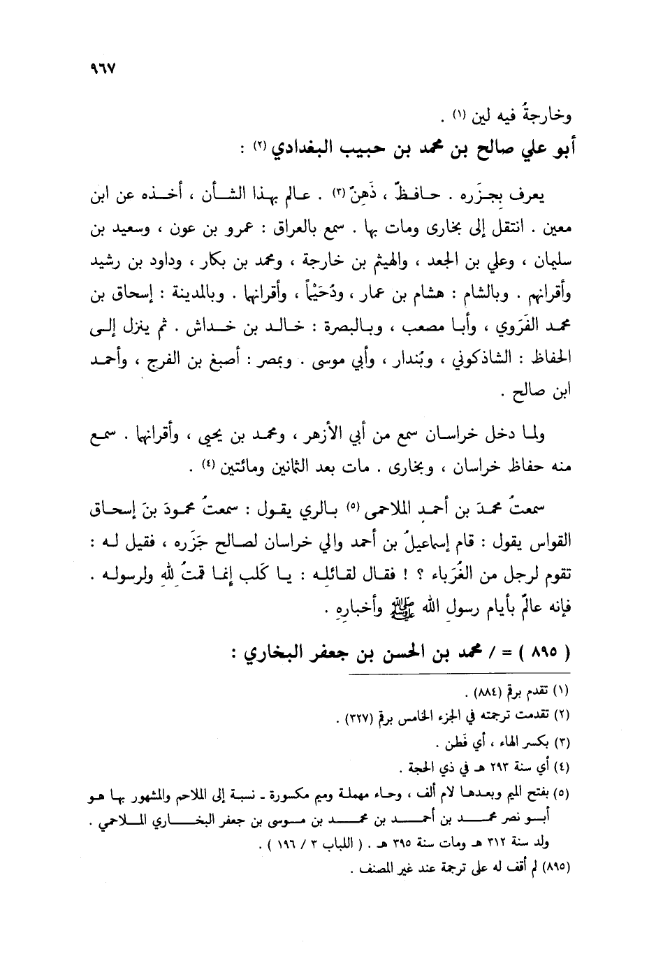§أَبُو عَلِيٍّ صَالِحُ بْنُ مُحَمَّدِ بْنِ حَبِيبٍ الْبَغْدَادِيُّ يُعْرَفُ بِجَزَرَةَ، حَافِظٌ، ذَهِنٌ، عَالِمٌ بِهَذَا الشَّأْنِ، أَخَذَهُ عَنِ ابْنِ مَعِينٍ انْتَقِلْ إِلَى بُخَارَى، وَمَاتَ بِهَا، سَمِعَ بِالْعِرَاقِ عَمْرَو بْنَ عَوْنٍ، وَسَعِيدَ بْنَ سُلَيْمَانَ، وَعَلِيَّ بْنَ الْجَعْدِ، وَالْهَيْثَمَ بْنَ خَارِجَةَ، وَمُحَمَّدَ بْنَ بَكَّارٍ، وَدَاوُدَ بْنَ رُشَيْدٍ، وَأَقْرَانَهُمْ، وَبِالشَّامِ هِشَامَ بْنَ عَمَّارٍ، وَدُحَيْمًا، وَأَقْرَانَهُمَا، وَبِالْمَدِينَةِ إِسْحَاقَ بْنَ مُحَمَّدٍ الْفَرْوِيَّ، وَأَبَا مُصْعَبٍ، وَبِالْبَصْرَةِ خَالِدَ بْنَ خِدَاشٍ، ثُمَّ يَنْزِلُ إِلَى الْحُفَّاظِ: الشَّاذَكُونِيِّ، وَبُنْدَارٍ، وَأَبِي مُوسَى، وَبِمِصْرَ أُصْبُغَ بْنَ الْفَرَجِ، وَأَحْمَدَ بْنَ صَالِحٍ، وَلَمَّا دَخَلَ خُرَاسَانَ سَمِعَ مِنَ أَبِي الْأَزْهَرِ، وَمُحَمَّدِ بْنِ يَحْيَى، وَأَقْرَانِهِمَا، سَمِعَ مِنْهُ حُفَّاظُ خُرَاسَانَ، وَبُخَارَى، مَاتَ بَعْدَ الثَّمَانِينَ وَمِائَتَيْنِ. سَمِعْتُ مُحَمَّدَ بْنَ أَحْمَدَ الْمَلَاحِمِيَّ بِالرَّيِّ، يَقُولُ: سَمِعْتُ مَحْمُودَ بْنَ إِسْحَاقَ الْقَوَّاسَ يَقُولُ: قَامَ إِسْمَاعِيلُ بْنُ أَحْمَدَ وَالِي خُرَاسَانَ، لِصَالِحِ جَزَرَةَ فَقِيلَ لَهُ: تَقُومُ لِرَجُلٍ مِنَ الْغُرَبَاءِ؟ فَقَالَ لِقَائِلِهِ: يَا كَلْبُ، إِنَّمَا قُمْتُ لِلَّهِ وَلِرَسُولِهِ، فَإِنَّهُ عَالِمٌ بِأَيَّامِ رَسُولِ اللَّهِ صَلَّى اللهُ عَلَيْهِ وَسَلَّمَ وَأَخْبَارِهِ