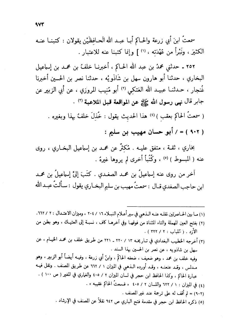 §أَبُو حَسَّانَ مَهِيبُ بْنُ سُلَيْمٍ بُخَارِيُّ، ثِقَةٌ، مُتَّفَقٌ عَلَيْهِ، مُكْثِرٌ عَنْ مُحَمَّدِ بْنِ إِسْمَاعِيلَ الْبُخَارِيِّ، رَوَى عَنْهُ الْمَبْسُوطَ، وَكُتُبًا أُخْرَى لَمْ يَرْوِهَا غَيْرُهُ، آخِرُ مَنْ رَوَى عَنْهُ إِسْمَاعِيلُ بْنُ مُحَمَّدٍ الصُّغْدِيُّ، كَتَبَ إِلَيَّ إِسْمَاعِيلُ بْنُ مُحَمَّدِ بْنِ حَاجِبٍ الصُّغْدِيُّ قَالَ: سَمِعْتُ مَهِيبَ بْنَ سُلَيْمٍ الْبُخَارِيَّ يَقُولُ: سَأَلْتُ عَبْدَ اللَّهِ -[974]- بْنَ أَحْمَدَ بْنِ حَنْبَلٍ، قُلْتُ كَمْ سَمِعْتَ مِنَ أَبِيكَ؟ قَالَ: الْبَعْضَ قُلْتُ: عَلَى حَالٍ؟ قَالَ: مِائَةُ أَلْفٍ وَبِضْعَةَ عَشَرَ أَلْفًا