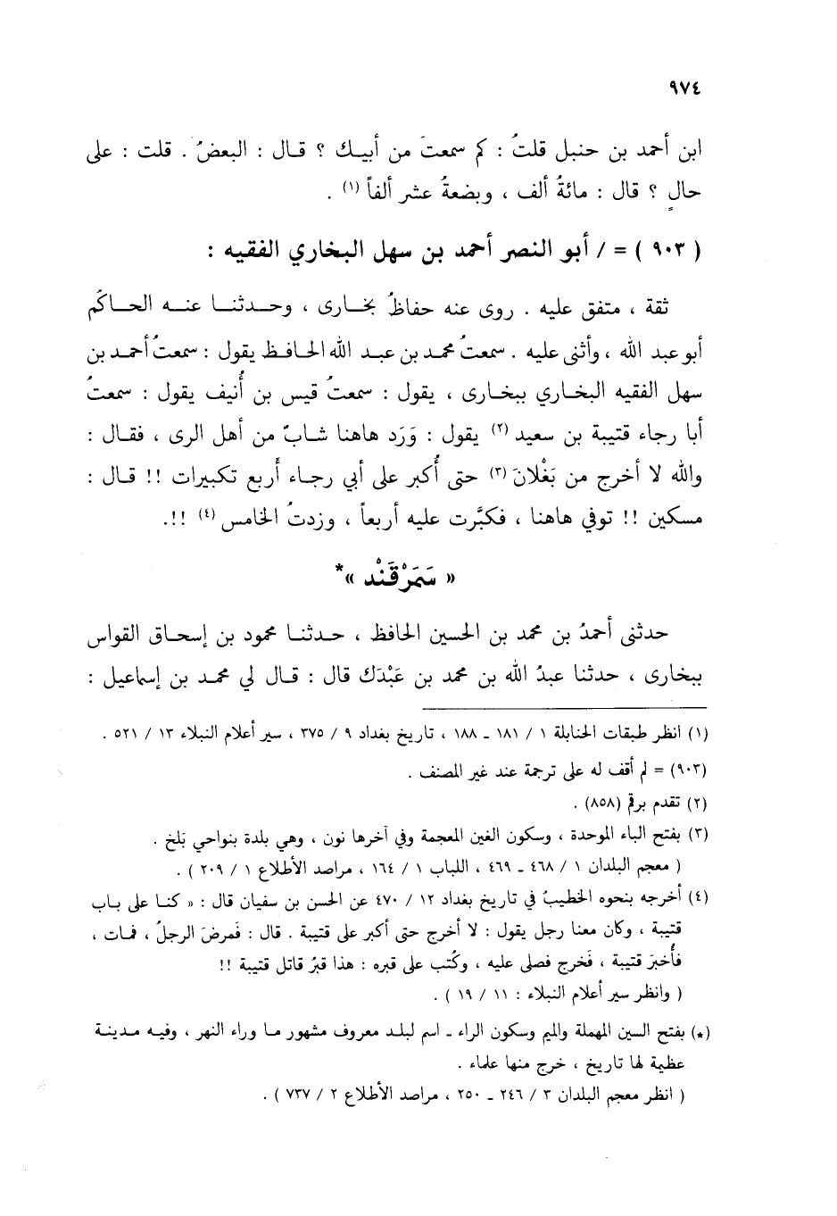 §903 - أَبُو النَّصْرِ أَحْمَدُ بْنُ سَهْلٍ الْبُخَارِيُّ الْفَقِيهُ ثِقَةٌ، مُتَّفَقٌ عَلَيْهِ، رَوَى عَنْهُ حُفَّاظُ بُخَارَى، وَحَدَّثَنَا عَنْهُ الْحَاكِمُ أَبُو عَبْدِ اللَّهِ، وَأَثْنَى عَلَيْهِ، سَمِعْتُ مُحَمَّدَ بْنَ عَبْدِ اللَّهِ الْحَافِظَ يَقُولُ: سَمِعْتُ أَحْمَدَ بْنَ سَهْلٍ الْفَقِيهَ الْبُخَارِيَّ بِبُخَارَى يَقُولُ: سَمِعْتُ قَيْسَ بْنَ أُنَيْفٍ، يَقُولُ: سَمِعْتُ أَبَا رَجَاءٍ قُتَيْبَةَ بْنَ سَعِيدٍ، يَقُولُ: وَرَدَ هَاهُنَا شَابٌّ مِنْ أَهْلِ الرَّيِّ فَقَالَ: وَاللَّهِ لَا أَخْرُجُ مِنْ بَغْلَانَ حَتَّى أُكَبِّرَ عَلَى أَبِي رَجَاءٍ أَرْبَعَ تَكْبِيرَاتٍ، قَالَ: مِسْكِينٌ تُوُفِّيَ هَاهُنَا، فَكَبَّرْتُ عَلَيْهِ أَرْبَعًا وَزِدْتُ الْخَامِسَ