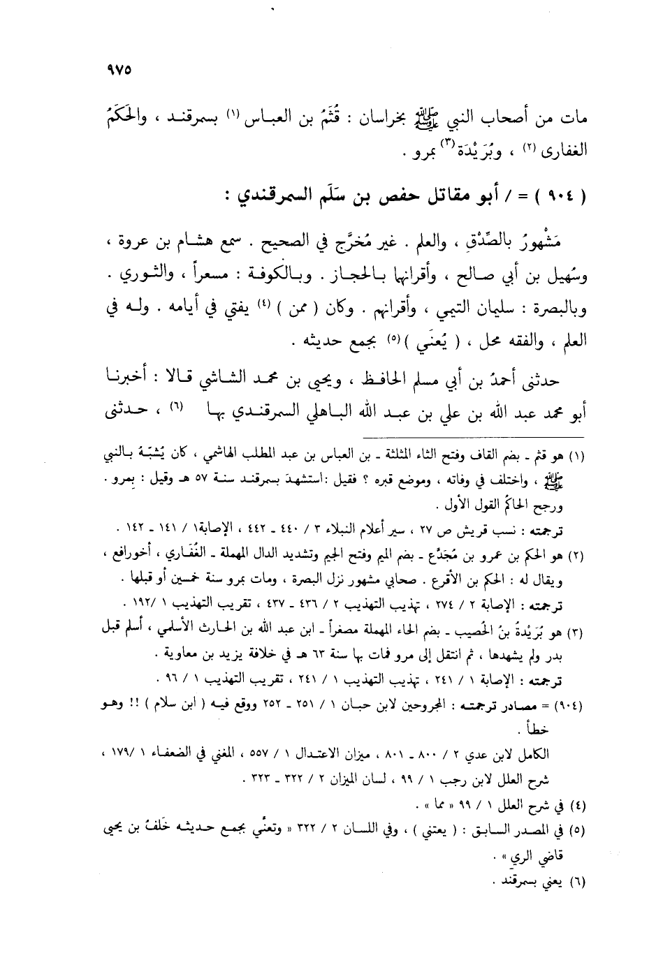 §أَبُو مُقَاتِلٍ حَفْصُ بْنُ سَلْمٍ السَّمَرْقَنْدِيُّ مَشْهُورٌ بِالصِّدْقِ، وَالْعِلْمِ، غَيْرُ مُخَرَّجٍ فِي الصَّحِيحِ، سَمِعَ هِشَامَ بْنَ عُرْوَةَ، وَسُهَيْلَ بْنَ أَبِي صَالِحٍ، وَأَقْرَانَهُمَا بِالْحِجَازِ، وَبِالْكُوفَةِ مِسْعَرًا، وَالثَّوْرِيَّ، وَبِالْبَصْرَةِ سُلَيْمَانَ التَّيْمِيَّ، وَأَقْرَانَهُمْ، وَكَانَ مِمَّنْ يُفْتِي فِي أَيَّامِهِ، وَلَهُ فِي الْعِلْمِ وَالْفِقْهِ مَحِلٌّ، يُعْنَى بِجَمْعِ حَدِيثِهِ. حَدَّثَنِي أَحْمَدُ بْنُ أَبِي مُسْلِمٍ الْحَافِظُ، وَيَحْيَى بْنُ مُحَمَّدٍ الشَّاشِيُّ، قَالَا: أَخْبَرَنَا أَبُو مُحَمَّدٍ عَبْدُ اللَّهِ بْنُ عَلِيِّ بْنِ عَبْدِ اللَّهِ الْبَاهِلِيُّ السَّمَرْقَنْدِيُّ، بِهَا حَدَّثَنِي