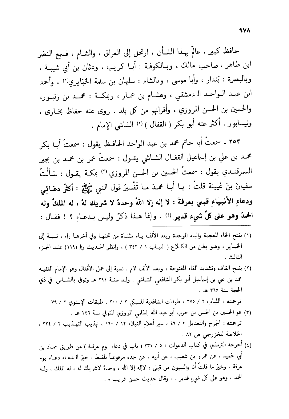 حَافِظٌ، كَبِيرٌ، عَالِمٌ بِهَذَا الشَّأْنِ، ارْتَحَلَ إِلَى الْعِرَاقِ، وَالشَّامِ، فَسَمِعَ النَّضْرَ بْنَ طَاهِرٍ صَاحِبَ مَالِكٍ، وَبِالْكُوفَةِ أَبَا كُرَيْبٍ، وَعُثْمَانَ بْنَ أَبِي شَيْبَةَ، وَبِالْبَصْرَةِ بُنْدَارَ، وَأَبَا مُوسَى، وَبِالشَّامِ سُلَيْمَانَ بْنَ سَلَمَةَ الْخَبَايِرِيَّ، وَأَحْمَدَ بْنَ عَبْدِ الْوَاحِدِ الدِّمَشْقِيَّ، وَهِشَامَ بْنَ عَمَّارٍ، وَبِمَكَّةَ مُحَمَّدَ بْنَ زُنْبُورٍ، وَالْحُسَيْنَ بْنَ الْحَسَنِ الْمَرْوَزِيَّ، وَأَقْرَانَهُمْ مِنْ كُلِّ بَلَدٍ، رَوَى عَنْهُ حُفَّاظُ بُخَارَى وَنَيْسَابُورَ، أَكْثَرَ عَنْهُ أَبُو بَكْرٍ الْقَفَّالُ الشَّاشِيُّ الْإِمَامُ سَمِعْتُ أَبَا حَاتِمٍ مُحَمَّدَ بْنَ عَبْدِ الْوَاحِدِ الْحَافِظَ يَقُولُ: سَمِعْتُ أَبَا بَكْرٍ مُحَمَّدَ بْنَ عَلِيِّ بْنِ إِسْمَاعِيلَ الْقَفَّالَ الشَّاشِيَّ يَقُولُ: سَمِعْتُ عُمَرَ بْنَ مُحَمَّدِ بْنِ بُجَيْرٍ السَّمَرْقَنْدِيَّ، يَقُولُ: سَمِعْتُ الْحُسَيْنَ بْنَ الْحَسَنِ الْمَرْوَزِيَّ بِمَكَّةَ يَقُولُ: سَأَلْتُ سُفْيَانَ بْنَ عُيَيْنَةَ، قُلْتُ: يَا أَبَا مُحَمَّدٍ مَا تَفْسِيرُ قَوْلِ النَّبِيِّ صَلَّى اللهُ عَلَيْهِ وَسَلَّمَ: " أَكْثَرُ دُعَائِي وَدُعَاءِ الْأَنْبِيَاءِ قَبْلِي بِعَرَفَةَ: لَا إِلَهَ إِلَّا اللَّهُ وَحْدَهُ لَا شَرِيكَ لَهُ لَهُ الْمُلْكُ، وَلَهُ الْحَمْدُ، وَهُوَ عَلَى كُلِّ شَيْءٍ قَدِيرٌ" وَإِنَّمَا هَذَا ذِكْرٌ وَلَيْسَ بِدُعَاءٍ، فَقَالَ