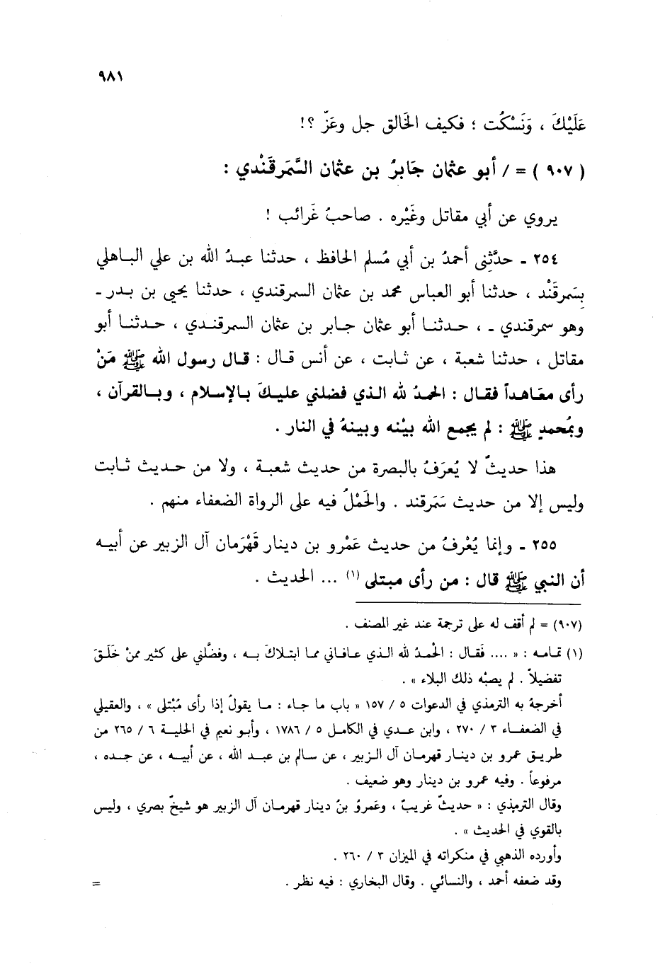 حَدَّثَنِي أَحْمَدُ بْنُ أَبِي مُسْلِمٍ الْحَافِظُ، حَدَّثَنَا عَبْدُ اللَّهِ بْنُ عَلِيٍّ الْبَاهِلِيُّ بِسَمَرْقَنْدَ، حَدَّثَنَا أَبُو الْعَبَّاسِ مُحَمَّدُ بْنُ عُثْمَانَ السَّمَرْقَنْدِيُّ، حَدَّثَنَا يَحْيَى بْنُ بَدْرٍ، وَهُوَ سَمَرْقَنْدِيُّ، حَدَّثَنَا أَبُو عُثْمَانَ جَابِرُ بْنُ عُثْمَانَ السَّمَرْقَنْدِيُّ، حَدَّثَنَا أَبُو مُقَاتِلٍ، حَدَّثَنَا شُعْبَةُ، عَنْ ثَابِتٍ، عَنْ أَنَسٍ، قَالَ: قَالَ رَسُولُ اللَّهِ صَلَّى اللهُ عَلَيْهِ وَسَلَّمَ: " §مَنْ رَأَى مُعَاهَدًا فَقَالَ: الْحَمْدُ لِلَّهِ الَّذِي فَضَّلَنِي عَلَيْكَ بِالْإِسْلَامِ، وَبِالْقُرْآنِ، وَبِمُحَمَّدٍ صَلَّى اللهُ عَلَيْهِ وَسَلَّمَ لَمْ يَجْمَعِ اللَّهُ بَيْنَهُ وَبَيْنَهُ فِي النَّارِ " هَذَا حَدِيثٌ لَا يُعْرَفُ بِالْبَصْرَةِ مِنْ حَدِيثِ شُعْبَةَ، وَلَا مِنْ حَدِيثِ ثَابِتٍ، وَلَيْسَ إِلَّا مِنْ حَدِيثِ سَمَرْقَنْدَ، وَالْحَمْلُ فِيهِ عَلَى الرُّوَاةِ الضُّعَفَاءِ مِنْهُمْ وَإِنَّمَا يُعْرَفُ مِنْ حَدِيثِ عَمْرِو بْنِ دِينَارٍ قَهْرَمَانَ آلِ الزُّبَيْرِ عَنْ أَبِيهِ أَنَّ النَّبِيَّ صَلَّى اللهُ عَلَيْهِ وَسَلَّمَ قَالَ: «مَنْ رَأَى مُبْتَلًى» الْحَدِيثُ